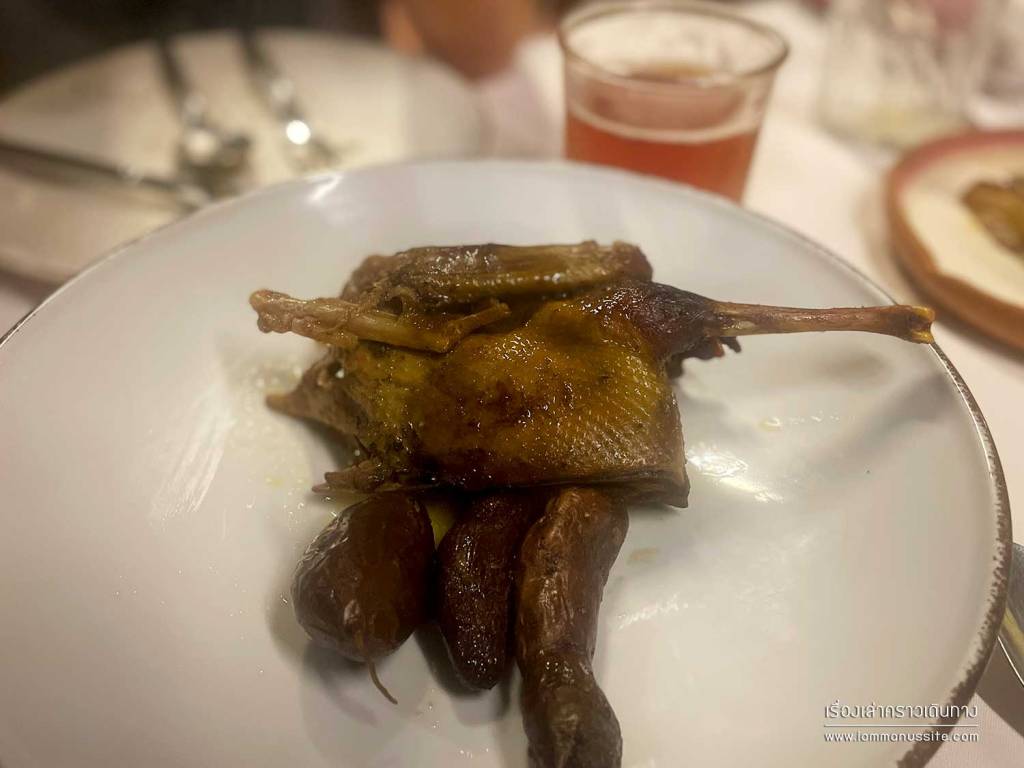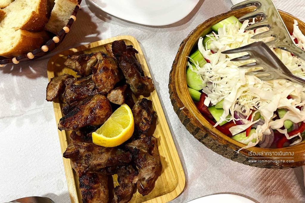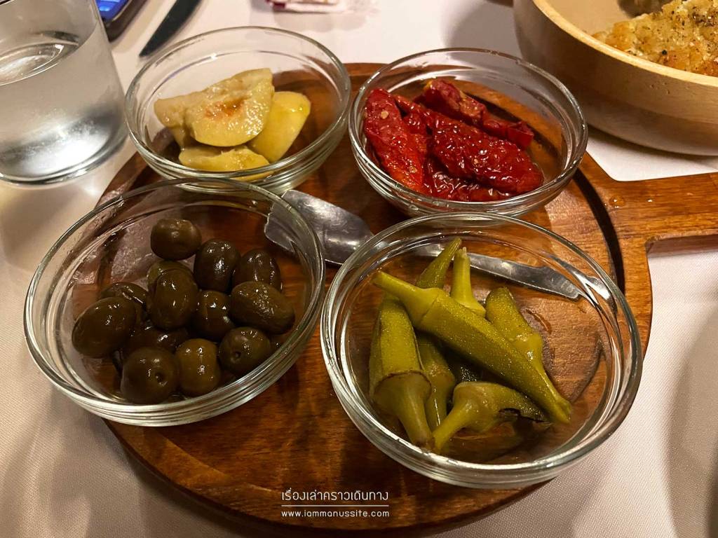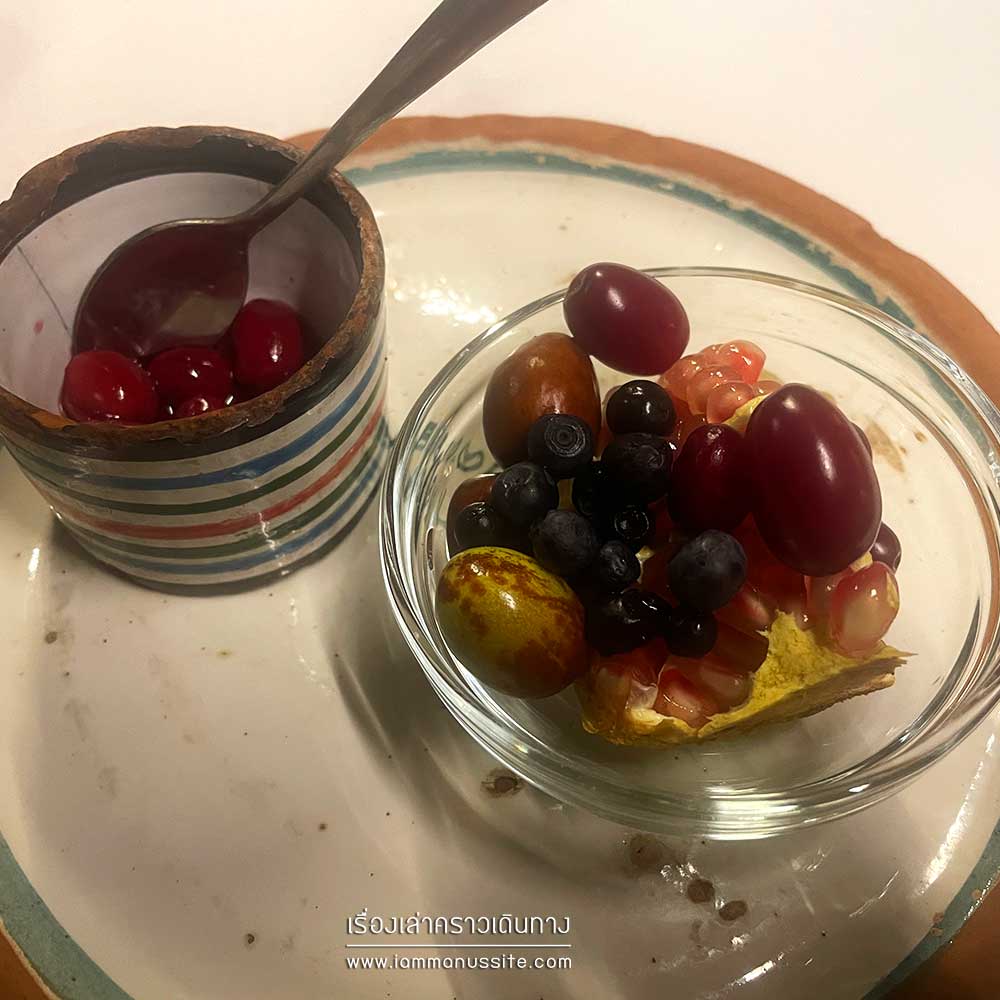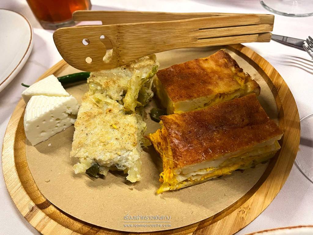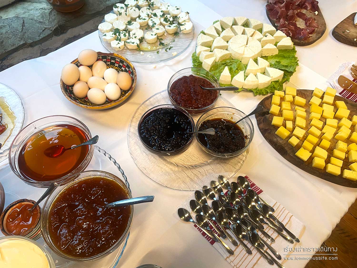 ห้องอาหารเดินลงเนินจากอาคารที่พักมานิดเดียว ต้องจองโต๊ะล่วงหน้า เพราะคนนอกเข้ามาทานกันเยอะ มักจะเต็ม อาหารมีแบบ Full course แต่เราเลือกได้ว่าจะเอาอะไรบ้าง พนักงานจะเดินมาอธิบายยาวเหยียด ว่าวันนี้มีอะไรบ้าง พนักงานดีมากบอกเราว่าให้เอาแค่ Appetizers กับ Starter ก่อน ถ้าไม่อิ่มค่อยเพิ่ม Main course ซึ่งก็จริง อิ่มมาก มื้อนี้แพงที่สุดในทริปเช่นกัน (ประมาณ 4000 Lek)