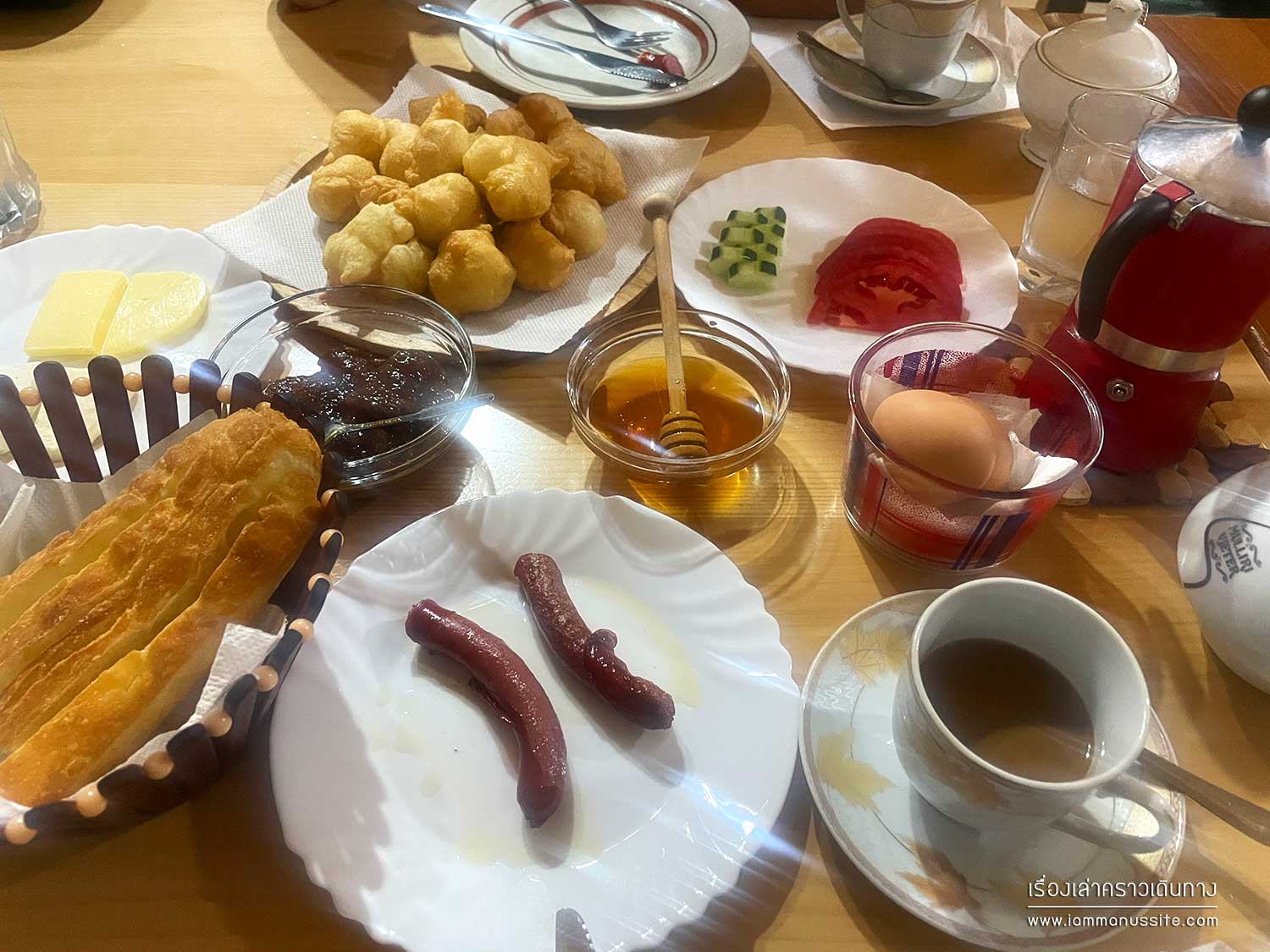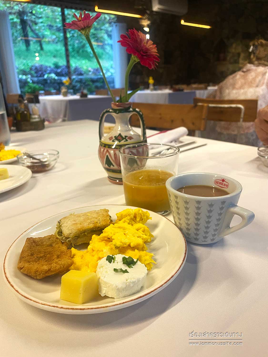 ตื่นเช้ามาฝนตกอีกแล้ว อากาศขมุกขมัวหน่อย แต่ฝนไม่หนัก ก็พอจะเดินเล่นชมฟาร์มได้อยู่ เดินลงไปทานอาหารเช้าก่อน อาหารหน้าตาคล้ายๆ Appetizer เมื่อคืนเลย แค่มีไข่ต้ม ไข่คน กับ ชา กาแฟ น้ำผลไม้ เพิ่มมาหน่อย