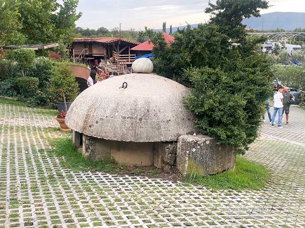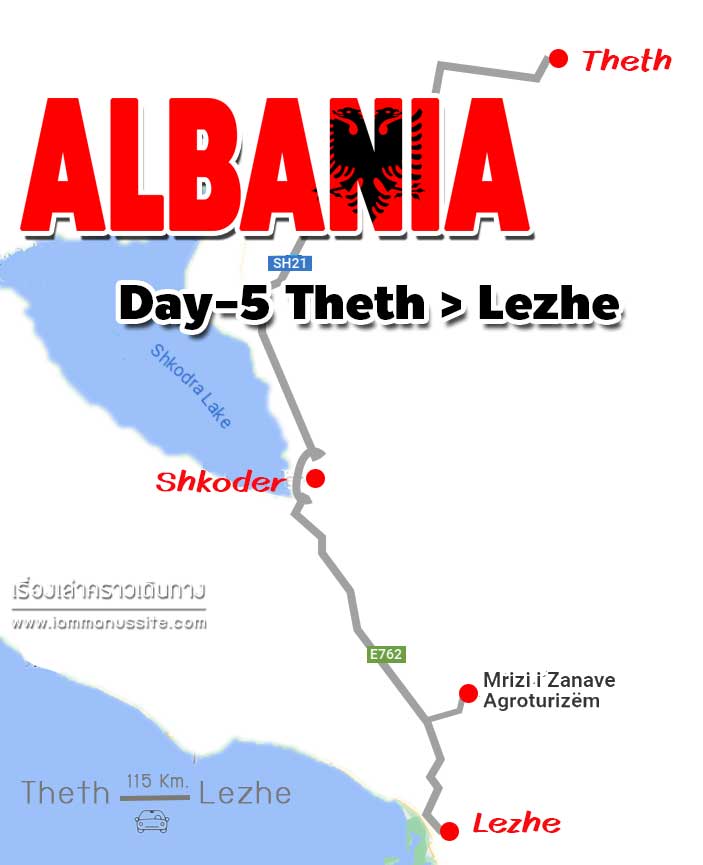 Lezhe เป็นชื่อเขตด้วยและมีเมืองหลวงชื่อ Lezhe ด้วย แต่ที่พักของเราคืนนี้ไม่ได้อยู่ในตัวเมือง Lezhe แต่อยู่นอกตัวเมืองออกมาทาง Shkoder เป็นที่พักชื่อดังในแถบนี้ Mrizi i Zanave Agroturizëm เปรียบเทียบให้เห็นภาพง่ายๆ อารมณ์เหมือนฟาร์มโชคชัย มีทั้งที่พัก มีห้องอาหาร มีสวนผลไม้ สนผัก มีไร่องุ่น มีโรงบ่มไวน์ โรงบ่มชีส มีคอกเป็ด คอกม้า มีครบทุกอย่างของสวนเกษตร ห้องพักมีไม่มาก แต่ห้องอาหารใหญ่มาก คนมาเที่ยวกันเยอะ พาเด็กๆมาดูฟาร์ม มาเที่ยวชมไร่ชมสวน แล้วก็มากินข้าว วันที่เราไปพักเป็นวันอาทิตย์คนเลยเยอะเป็นพิเศษ ห้องพักเต็ม จองล่วงหน้ามา 2 เดือนได้ห้องสุดท้ายที่เป็น Family room ราคาเลยแพงหน่อย แพงที่สุดในทริปแล้ว แต่ห้องพักดีมาก วิวก็ดี พนักงานดีเด่นทุกคน