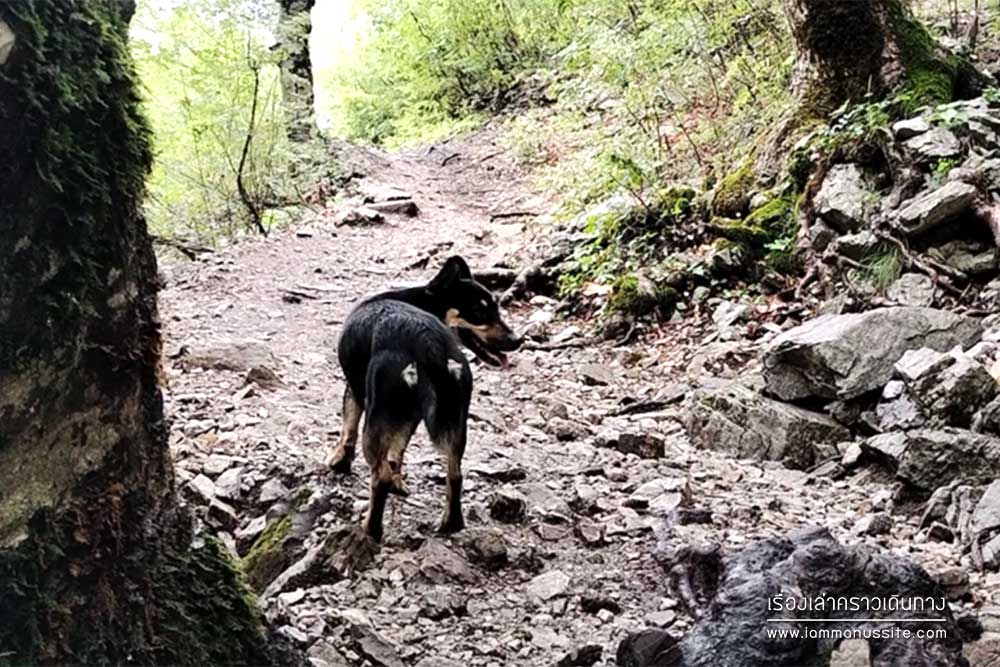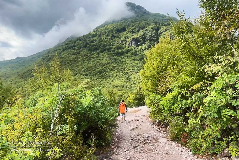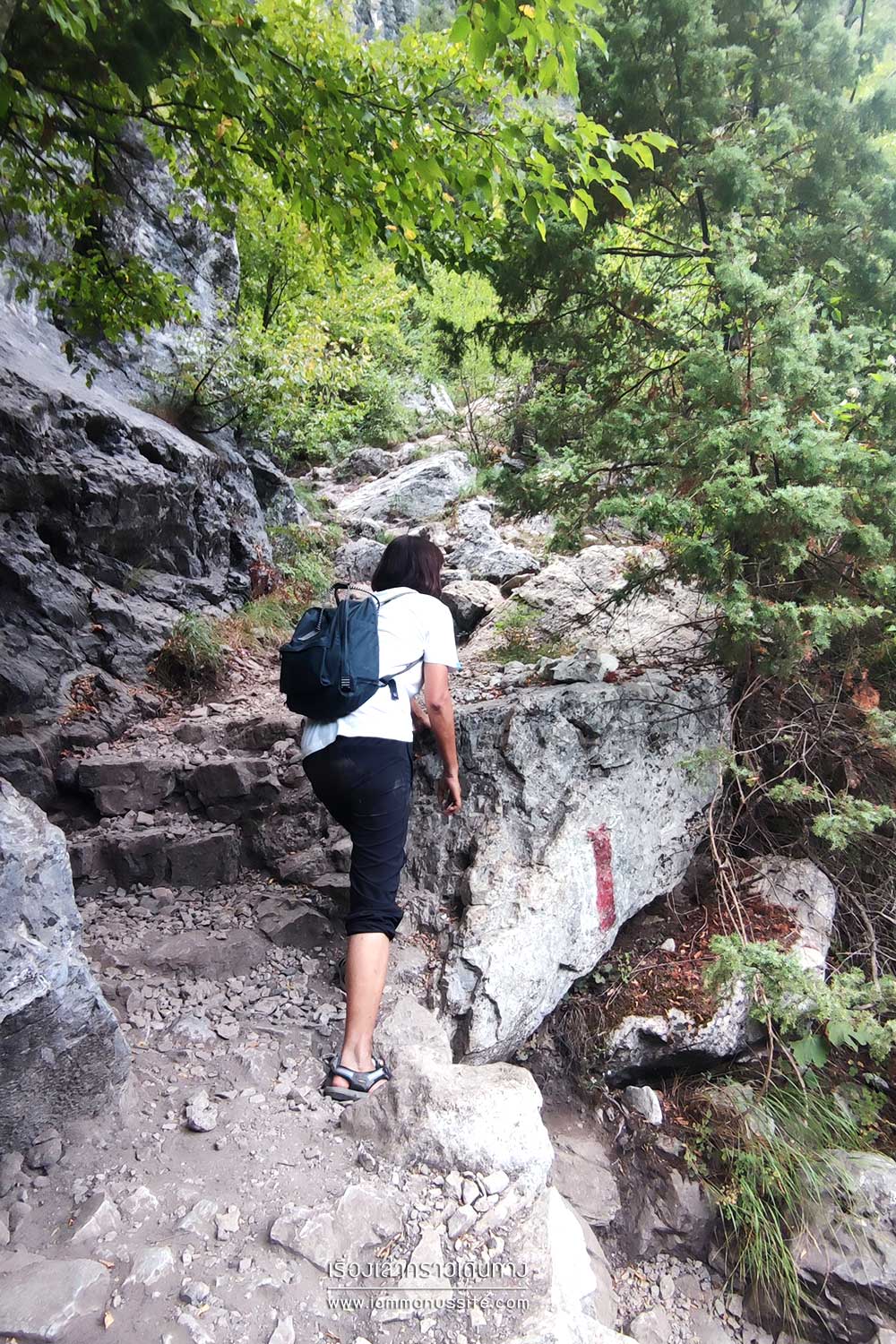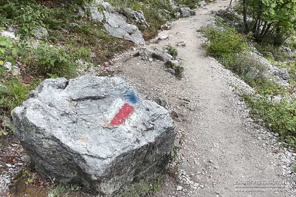 ไม่มีป้ายบอกทางใดๆ อาศัยเดินตามๆกันไป และมองหาสัญญลักษณ์บอกทางคือแถบสีแดงตามก้อนหิน ไม่มีหัวลูกศรใดๆ แต่บอกว่าแนวนี้แหละถูกต้อง ช่วงแรกๆเป็นถนนที่รถพอขับไปได้แต่ทางแย่มากและชันมาก เดินเอาดีกว่า