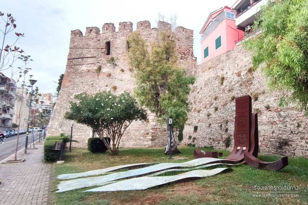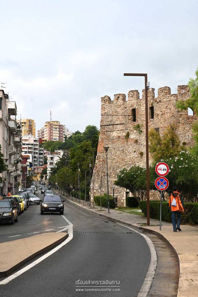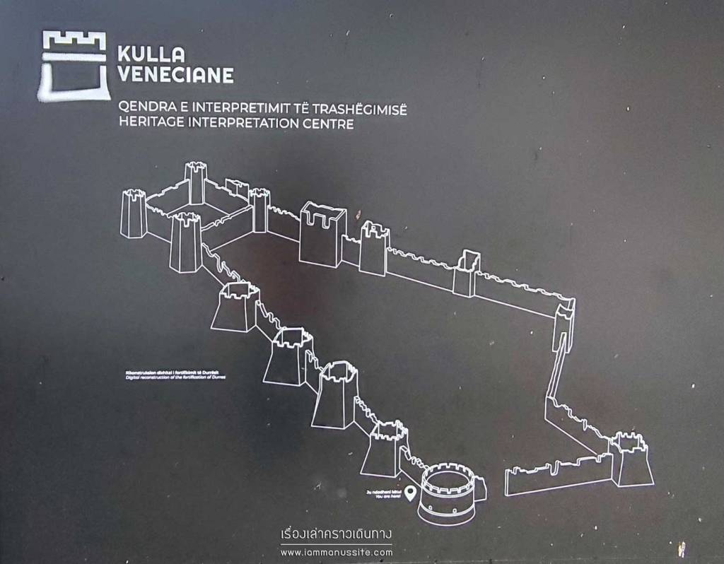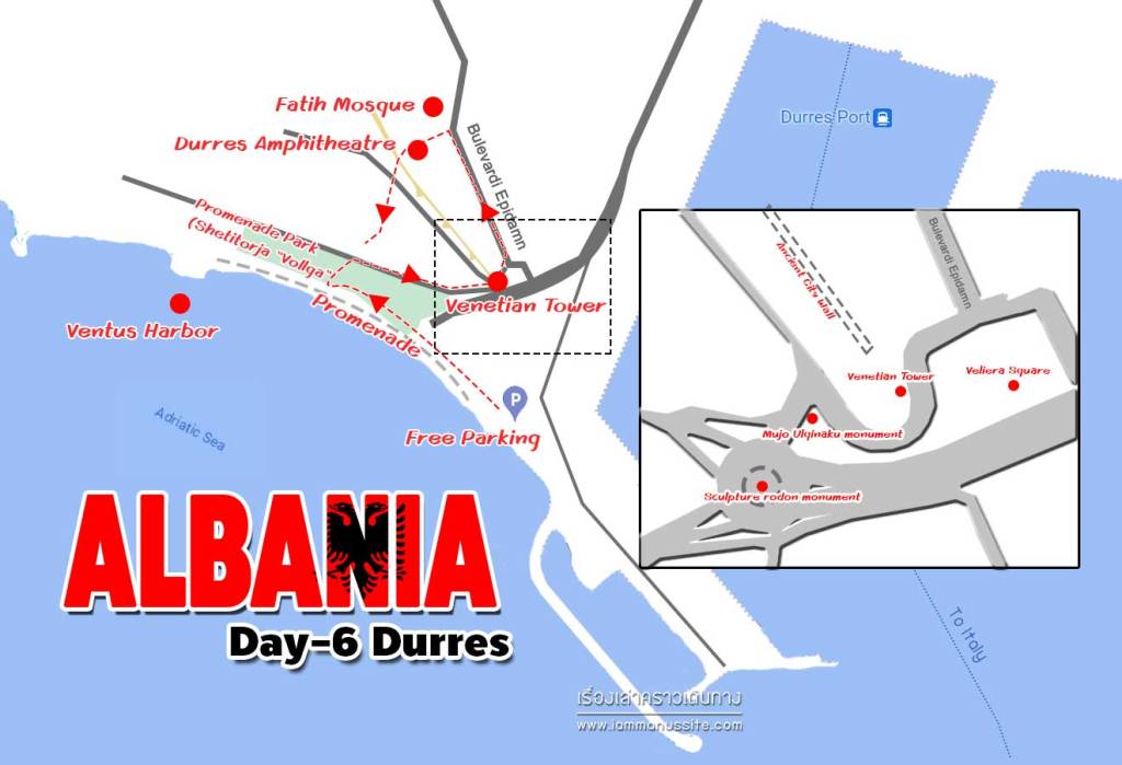 จากริมชายหาดข้ามถนนเดินเข้าไปเที่ยวในเมือง เริ่มที่ Venetian Tower แล้วแอบเดินตามกลุ่ม walking tour ไปตามถนน Bulevardi Epidamn ตรงไปทาง Fatih Mosque (Xhamia e Madhe) ซ้ายมือคือไฮไลต์ของเมือง Durres Amphitheatre แล้วเดินลอดกำแพงเมืองเก่าเลาะตามแนวกำแพง วนกลับที่จอดรถ ลมเริ่มแรงเหมือนพายุจะเข้า เลยแวะกิน Shawarma ร้านป้าริมถนนอย่างรีบด่วน แล้วขึ้นรถรีบออกเดินทางต่อก่อนฝนถล่ม