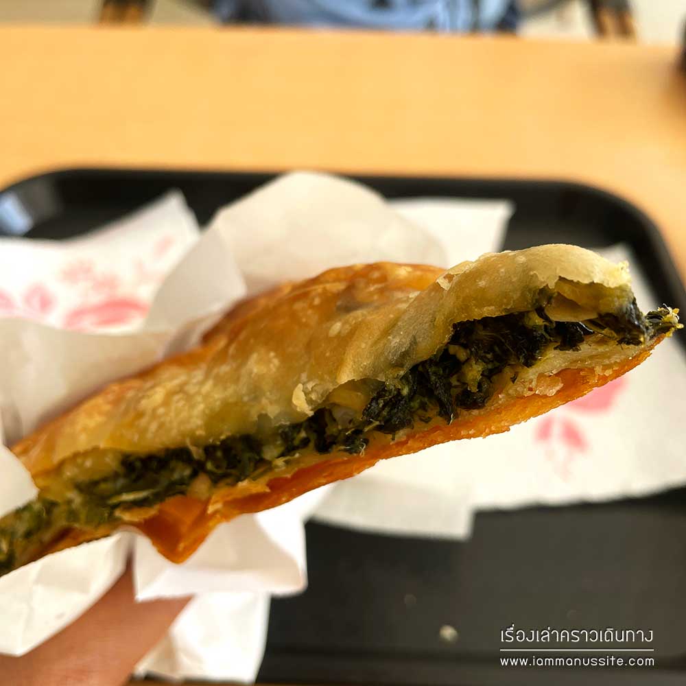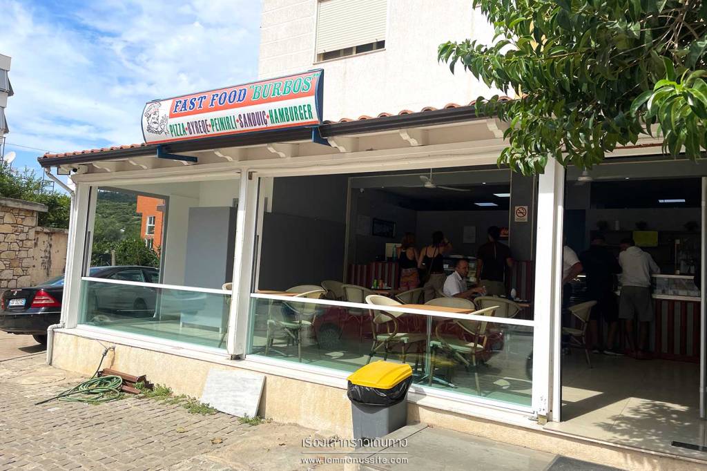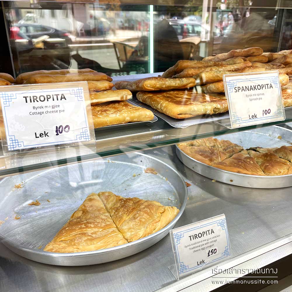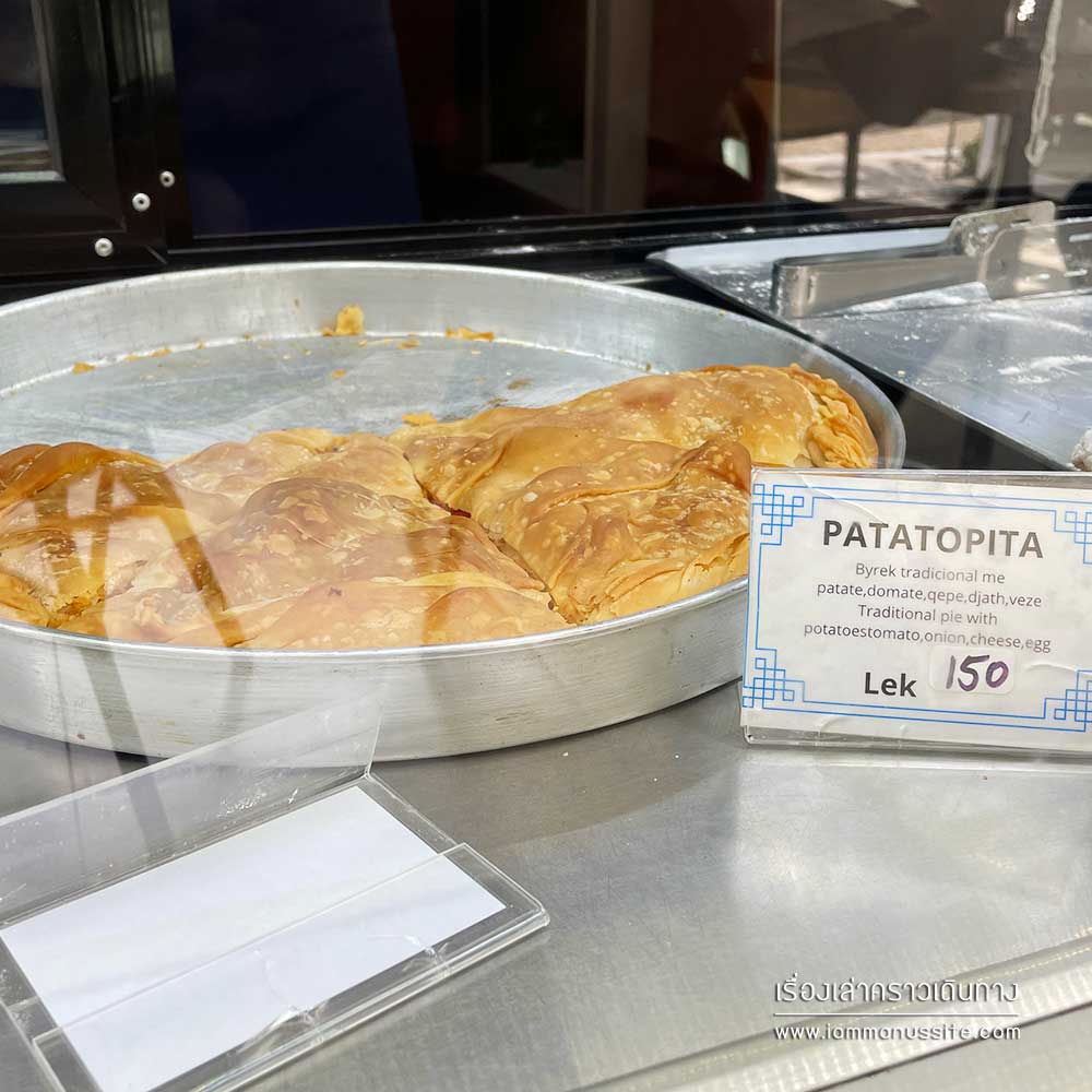มื่อเที่ยงแวะทานเที่ยงที่ Himare ตามแผน มื้อนี้เลือกกินง่ายๆที่ร้าน Pizza ร้านแบบนี้มีขายทั่วไปในแอลเบเนีย ไม่ได้ขายแต่พิซซ่า มีพายอีกหลากหลายชนิด มีคำอธิบายภาษาอังกฤษอยู่ให้พอเข้าใจ อย่างเช่นเราสั่ง Hotopita (Traditional Pie with Greens, Cheese Egg) อ่านส่วนผสมแล้วก็คิดว่ากินได้