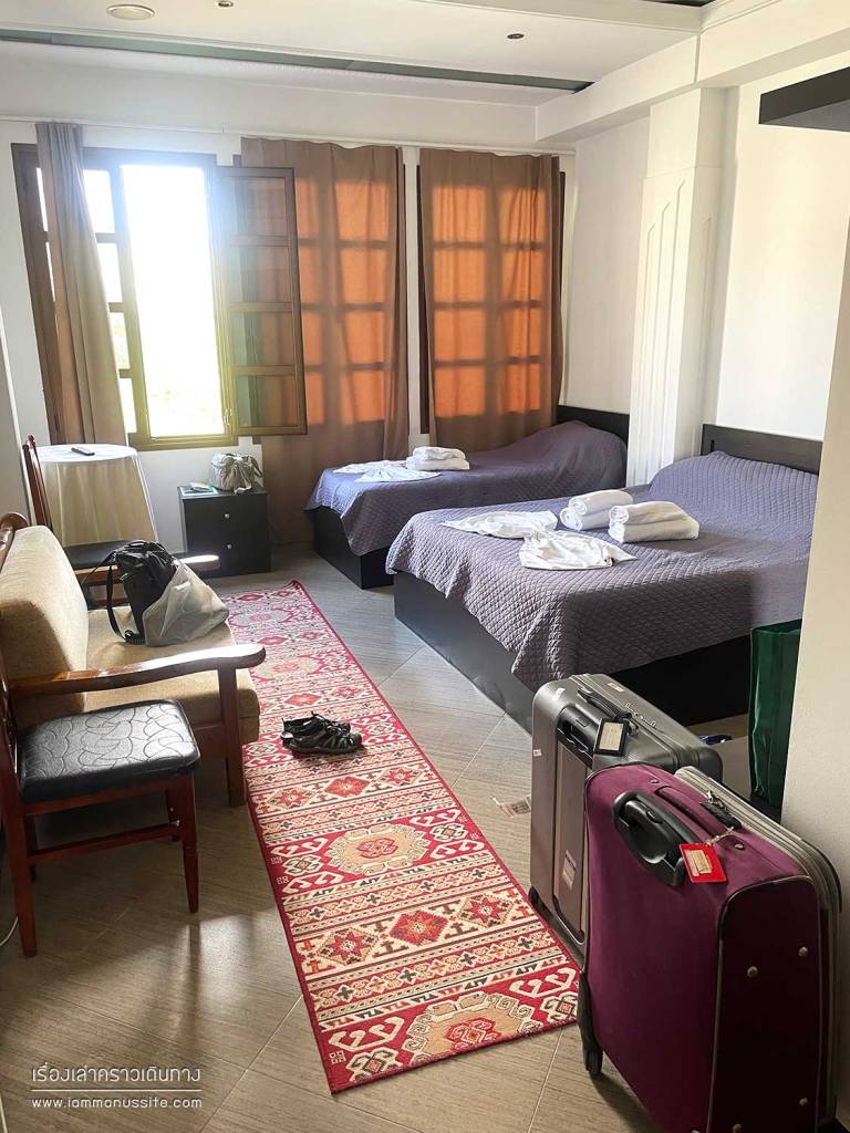 โรงแรมบรรยากาศทึมๆ เหมือนถ้ำเพราะสร้างอยู่บนเชิงเขา ใช้หินเป็นวัสดุก่อสร้างตามแบบดั้งเดิม เลือกห้อง 3 คน (แต่นอน 2 คน) ไม่มีระเบียงแต่มีหน้าต่างเปิดชมวิวได้ มุมดีพอสมควร ดูแผนผังแล้วห้อง 2 คนจะอยู่ชั้น 3 คือต้องแบกกระเป๋าขึ้นไป 3 ชั้น และห้องจะอยู่ตรงลานอาหารเช้า ซึ่งรู้สึกแปลกๆที่เปิดประตูห้องมาก็เจอโต๊ะอาหารเช้าเลย ดูไม่เป็นส่วนตัว เลยเลือกห้อง 3 คนที่ชั้น 2 แทน ห้องที่ได้พักสะอาดใช้ได้ แต่เตียงนอนไม่ค่อยสบาย ที่ไม่ชอบคือห้องน้ำ ค่อนข้างเก่า มีคราบดำตามร่องกระเบื้องและที่สำคัญน้ำรั่ว คืออาบน้ำแล้วน้ำซึมออกมาในห้องนอน ไหลมากระเป๋าเดินทางเปียกอ่ะ ควรซ่อมแซมขนานใหญ่
