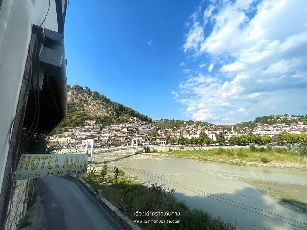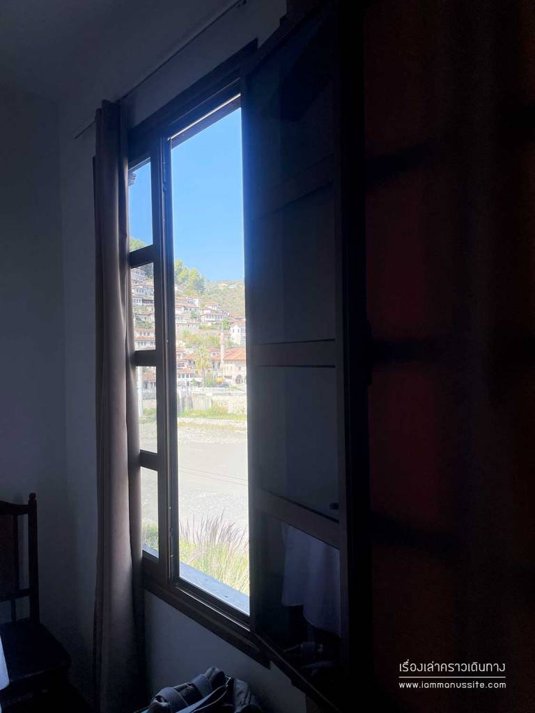 จุดเด่นของเมืองเบรัตคือ บ้านเรือนแบบออตโตมันที่สร้างเรียงรายตามเชิงเขา มองไปเห็นกรอบสีเหลี่ยมของประตูหน้าต่างมากมายจนเบรัตได้ฉายาว่า The City of Thousand Window เราจึงเลือกที่พักอยู่ฝั่งตรงข้ามแม่น้ำ (Gorica) เพื่อจะได้มุมมองไปที่วิวกระจกพันบานได้ตลอดเวลา โรงแรมที่เราคิดว่ามุมดีที่สุดคือ Hotel Muzaka แต่มันเต็ม เราจึงจองห้องพักที่ Hotel Ajka ห่างกันไม่ถึง 200 ม. มุมมองคล้ายๆกัน อยู่ใกล้สะพานที่ข้ามไปฝั่งเมืองเก่า