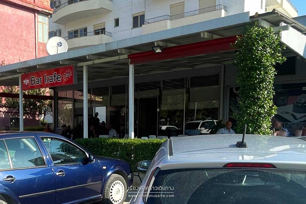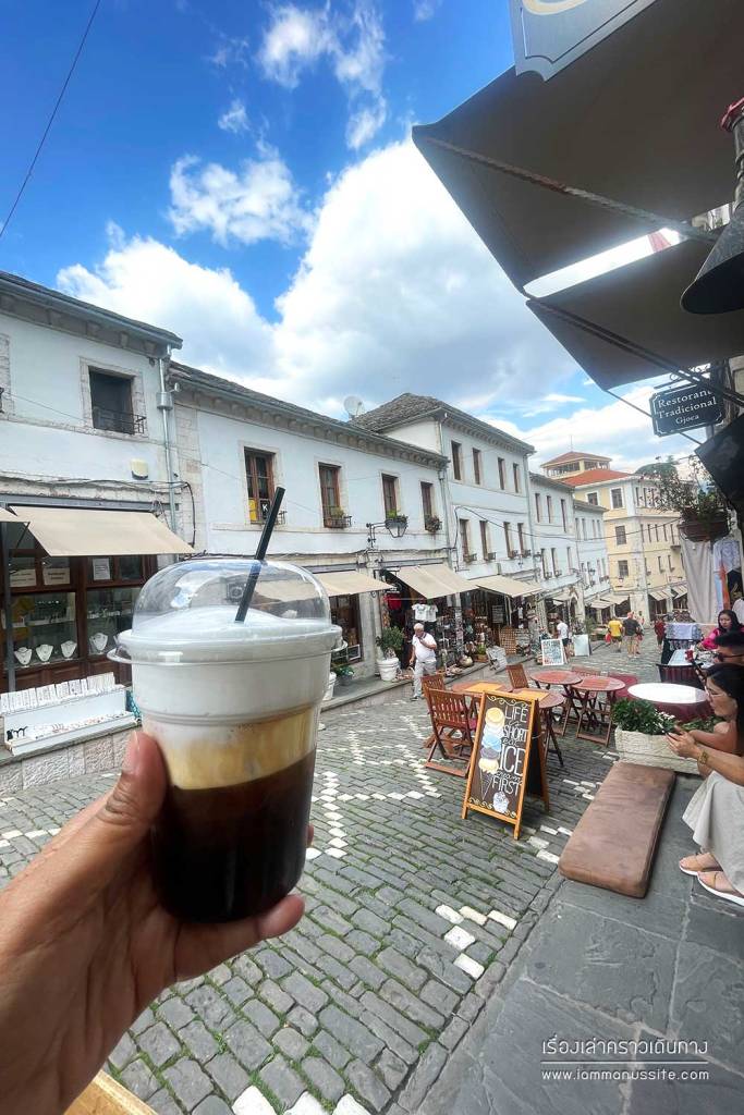 อากาศวันที่แดดดีแบบนี้ แม้ลมจะเย็นแต่แดดแรงแสบผิวมากๆ สู้ไม่ไหวต้องขอพักหลบแดดสักหน่อย เดินไปถนนคนเดิน Bulevardi Republika หาร้านกาแฟนั่งพักหน่อย เป็นร้านกาแฟร้านแรกในแอลเบเนียที่มีกาแฟแฟนซี อย่างกาแฟใส่น้ำส้ม กาแฟปั่นต่างๆ แถมมีเบเกอรี่หลากหลาย อารมณ์เหมือนคาเฟ่ในเมืองไทย