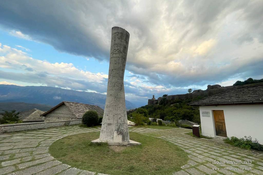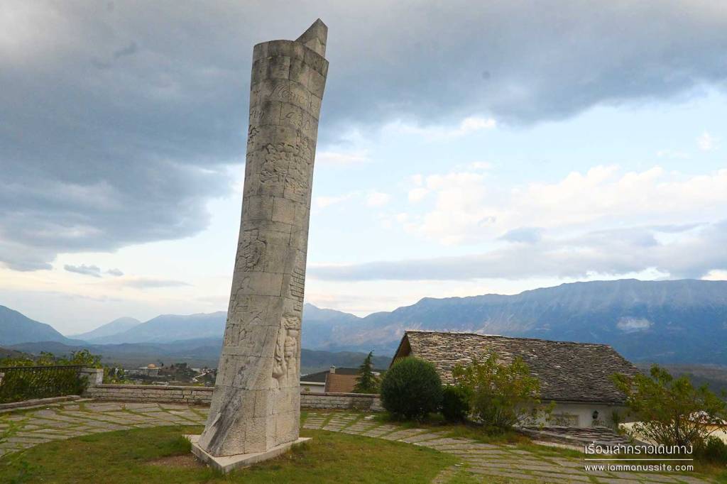 เสา Obelisk สูง 7 ม. สร้างขึ้นเพื่อเป็นที่ระลึกในการเฉลิมฉลองระบบการศึกษาของอัลแบเนีย ในค.ศ.ที่ 20 เพราะในยุคของออตโตมัน ไม่อนุญาตให้มีการเรียนการสอนภาษาท้องถิ่น ตึกสีขาวข้างๆคือ “liria” (freedom) school ที่เปิดสอนตั้งแต่ปี ค.ศ. 1895 เป็นโรงเรียนแห่งแรกในเมือง Gjirokastra ที่สอนด้วยภาษาอัลแบเนีย ปัจจุบันเป็น Gjirokaster Conservation and Development Organization (GCDO) ใช้เป็นสถานที่จัดกิจกรรมต่างๆ ลานด้านบนชมวิวได้ 360 องศา