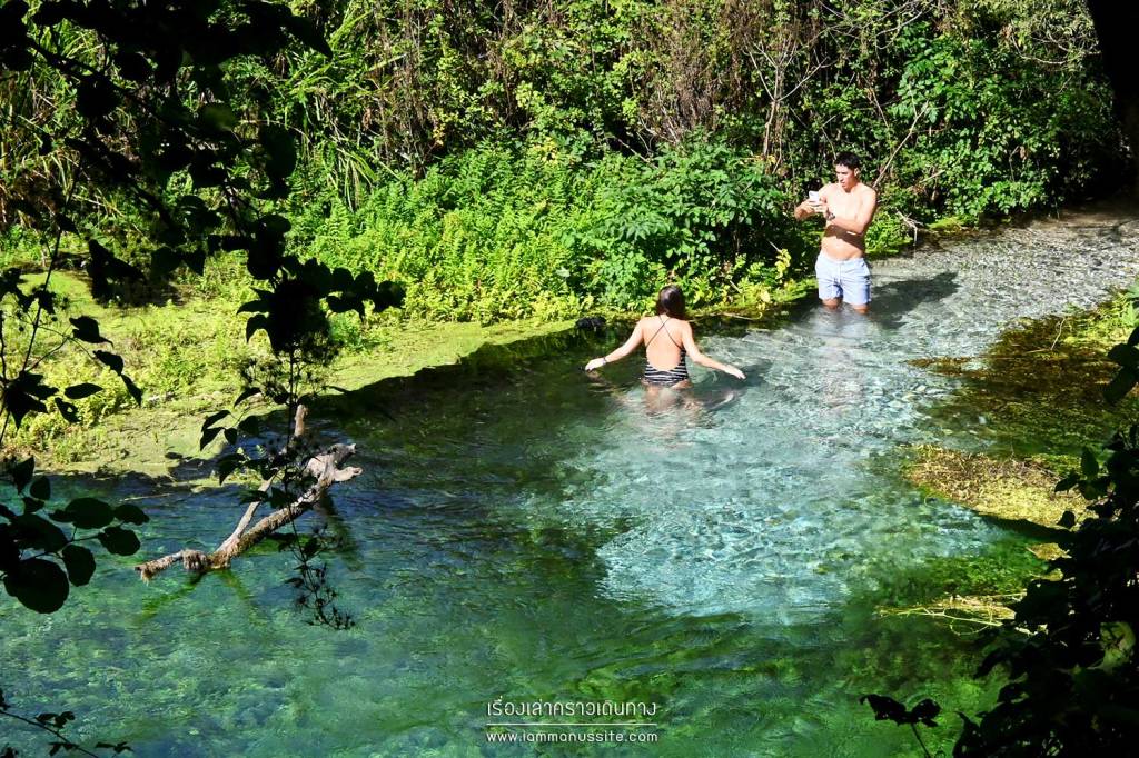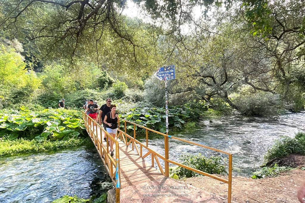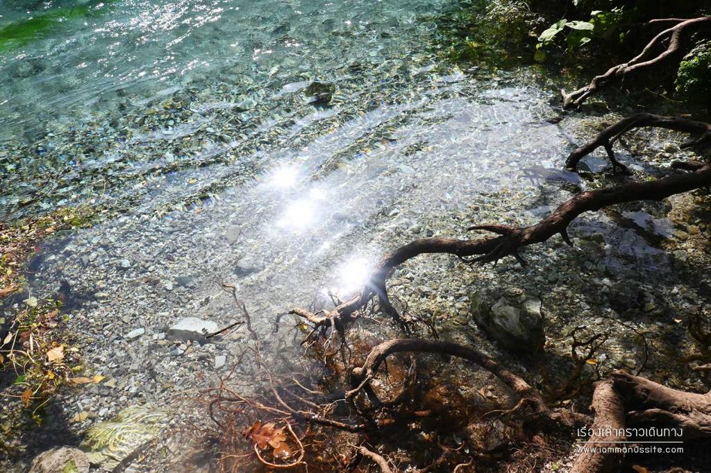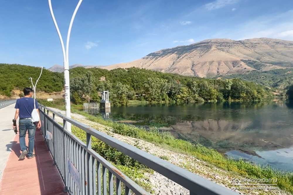 ค่าเข้า 100 Lek (ถูกกว่าค่าจอดรถอีก แค้นไม่หาย) ซื้อแล้วก็เดินข้ามสันเขื่อนของทะเลสาบเล็กๆไป (ทะเลสาบนี้คือน้ำที่มาจากน้ำผุด Blue Eye นั่นเอง) วันนี้แดดดีแดดแรง ร้อนเหงื่อซึมตั้งแต่ต้นทาง ทางที่เดินไปคือทางเท้าตามถนนนั่นแหละ แต่กั้นไว้ไม่ให้รถวิ่ง จะมีรถเจ้าหน้าที่วิ่งผ่านไปมาบ้าง ทางขึ้นเขาคดเคี้ยวไป 1.5 กม. แต่ไม่ได้ชันมาก ไม่เหนื่อยแต่ร้อน นึกสงสัยไปตลอดทางว่ามีถนนแต่ทำไมต้องให้เดิน (วะ)