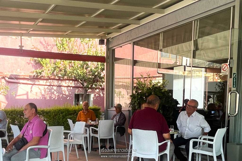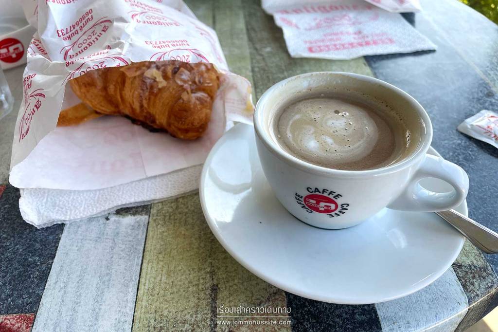 สุดท้ายก็ต้องวนรถกลับออกมา ไปเจอร้านกาแฟตรงถนนสายหลักเป็น Kafe 24Hr. แต่มีที่จอดก็จอดเลย มีคุณลุงคุณอามานั่งจิบกาแฟคุยกันเต็มระเบียงร้าน เหมือนสภากาแฟบ้านเรา แต่ร้านกาแฟแบบนี้ขายแต่กาแฟจริงๆ อยากได้ขนมปังรองท้องก็ไม่มี แต่พนักงานพาเราเดินเข้าซอยไปร้านเบเกอรี่ บอกให้เลือกซื้อแล้วเอาไปนั่งกินที่ร้านได้เลย น่ารักมาก