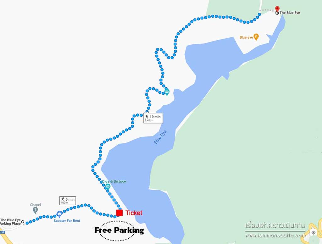 จาก Sarande ใช้เส้นทาง SH99 ระยะทาง 22 กม. ขับไปไม่ถึง 1 ชม.ก็ถึง Blue Eye ด่านแรกที่เจอคือลานจอดรถขนาดใหญ่ที่ใครๆก็เลี้ยวเข้ามาจอด เสียค่าจอด 200 Lek แล้วเดินขึ้นไปตามถนนอีก 400 ม. ถึงจะเจอที่ขายตั๋วเข้า Blue Eye ซึ่งตรงนี้ก็มีลานจอด ไม่เสียเงิน! และไม่ต้องเดิน!! แต่ลานนี้เล็กกว่า แนะนำว่าให้ขับเข้ามาดูก่อนถ้าเต็มค่อยลงไปจอดที่ลานด้านหน้า