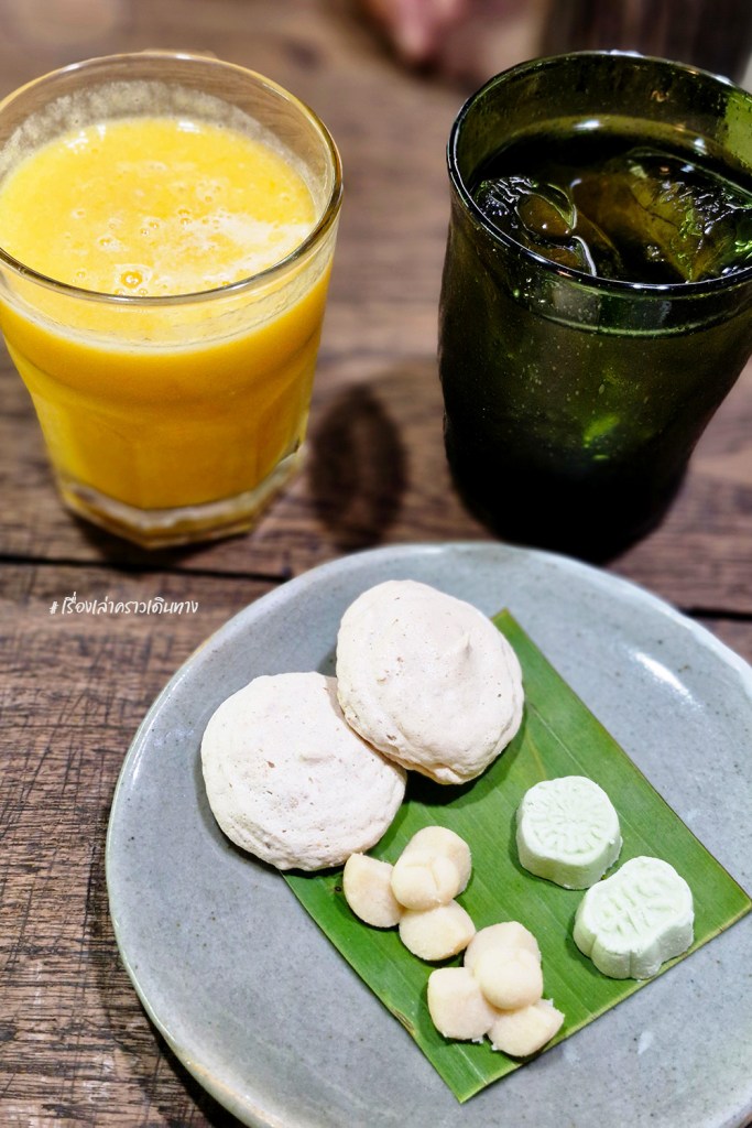 เป็นร้านเครื่องดื่มและขนมหวานที่เป็นขนมไทย อาคารเก่าแก่ ตกแต่งด้านในให้เปิดโล่ง มีบ้านไทยจากมุกดาหารที่ยกมาสร้างเป็นชั้นลอยให้นั่งได้ ผนังประดับด้วยงานรูปภาพศิลปะแบบชวนงง แต่รวมๆแล้วบรรยากาศก็ดูดีมีเสน่ห์ พวกเราเลือกสั่งน้ำมะยงชิดปั่น กับชุดขนมไทยและชาไมยราป สุดท้ายคือไอติมเกล็ดน้ำแข็งฝรั่งพริกกับเกลือน ขนมไทยมา 3 อย่าง ดอกลำดวน โสมนัส สัมปันนี อร่อยจริง หวานน้อยตามสมัยนิยม ไอติมฝรั่งเป็นน้ำฝรั่งปั่นที่เอ่าไปแช่เย็นจนเป็นเกล็ดน้ำแข็งมาพร้อมพริกกับเกลือที่เราว่าเหมือนน้ำปลาหวานเทราดลงไป ได้รสเค็มๆหวานๆกับความเย็นจนเสียวฟัน