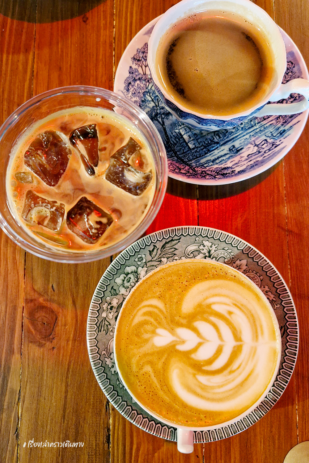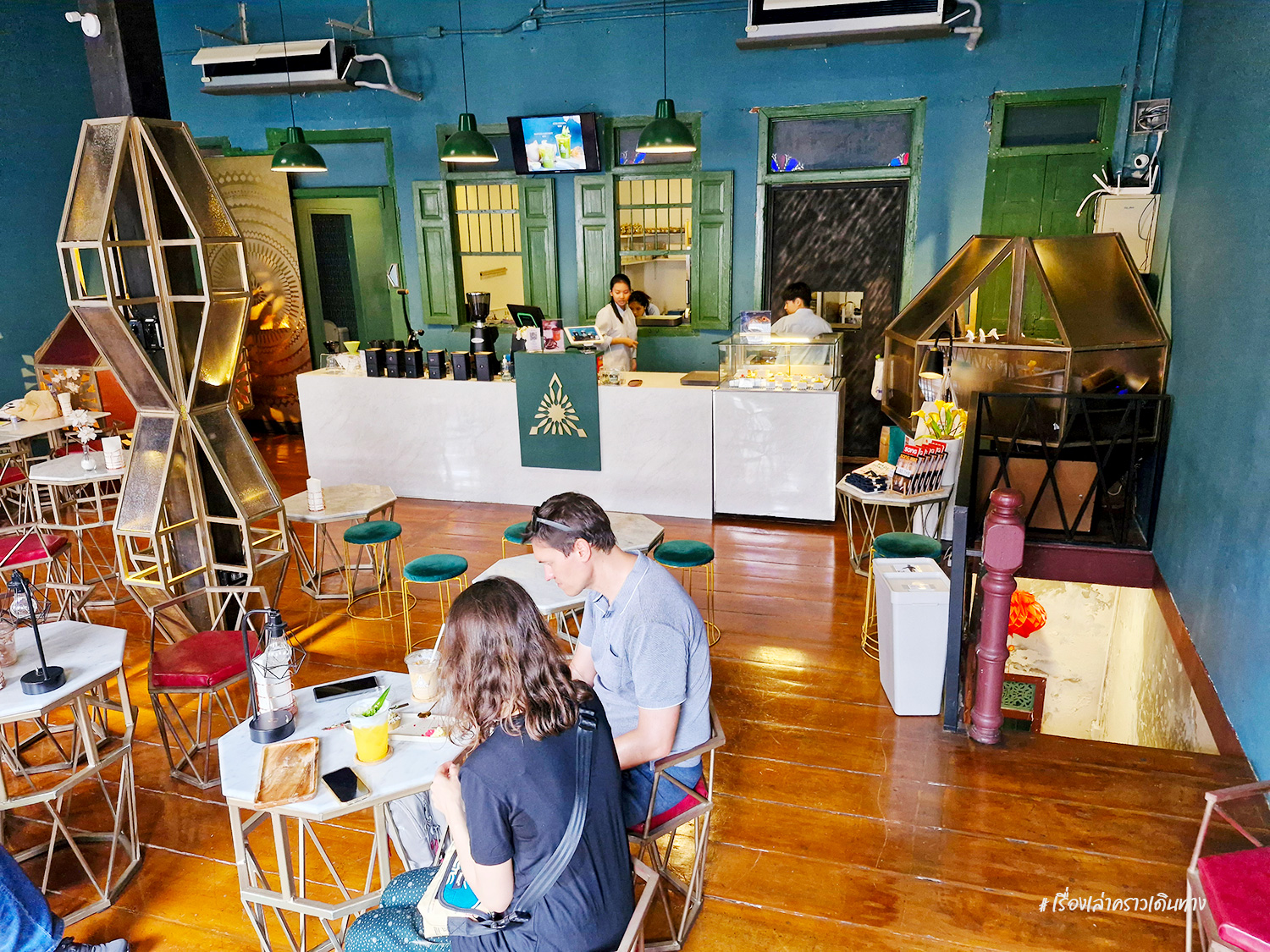 เครื่องดื่มมีให้เลือกหลากหลายเหมือนร้านคาเฟ่ทั่วไปทั้ง ชา กาแฟ ร้อน เย็น เราเลือกสั่ง Gek Huey Black Coffee คือกาแฟใส่น้ำเก๊กฮวยนั่นเอง กาแฟที่นี่เป็น Slow bar ไปนั่งดูบาริสต้าค่อยๆทำ Espresso shot เพลินๆ หันมองรอบๆดูผนังอาคารเก่ากับกระจกสีที่แสงอาทิตย์ส่องผ่านเข้ามาได้จนสว่างไสว แอร์เย็นสบาย