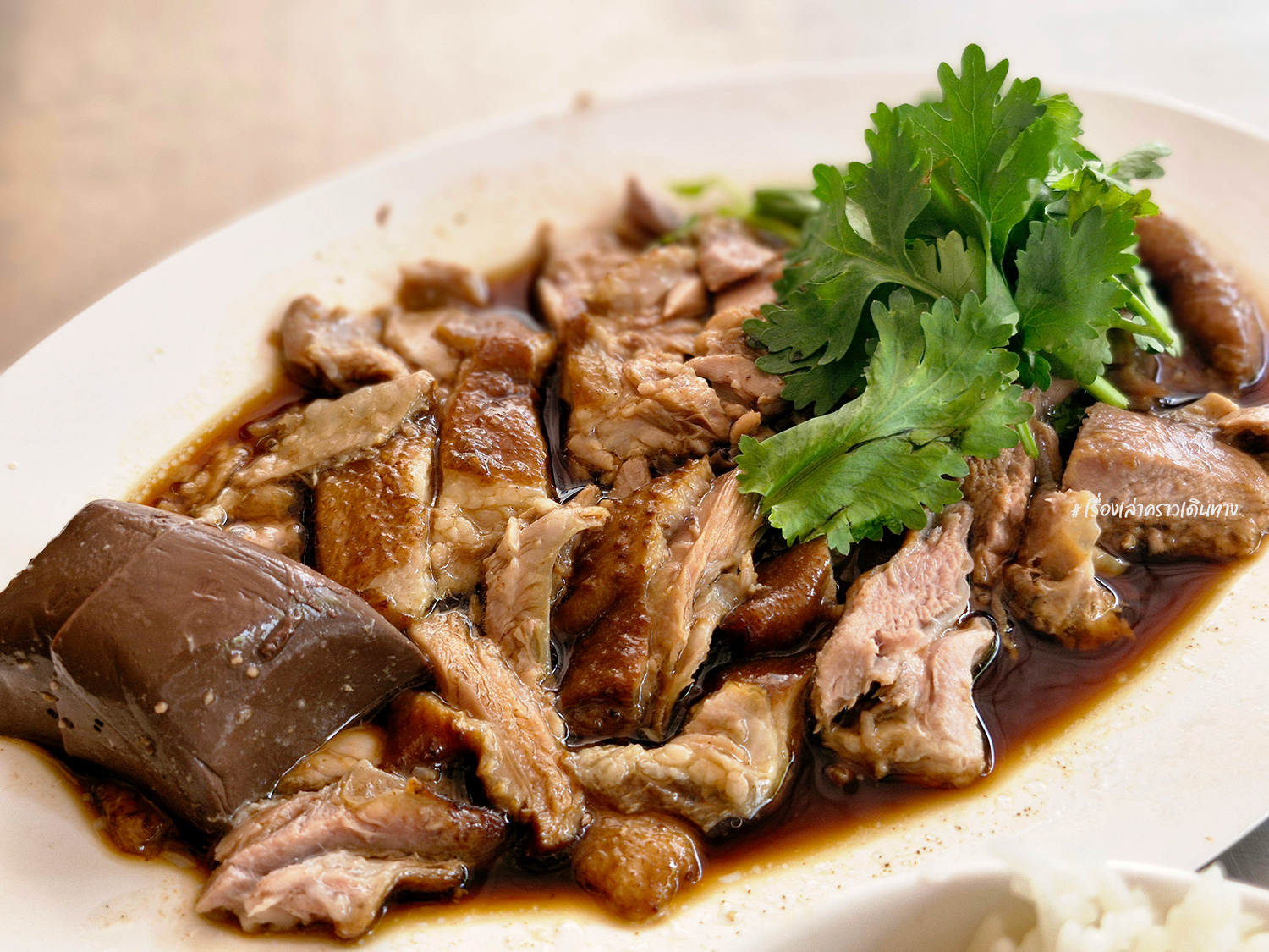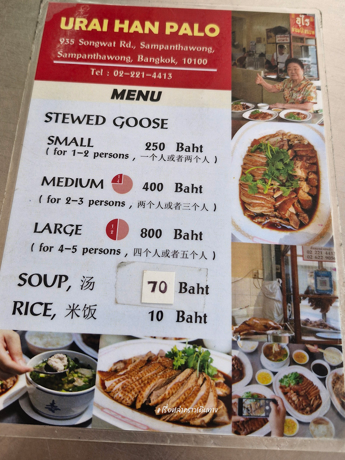 ห่านพะโล้เป็นจานมี 3 ขนาด 3 ราคา เล็ก(250) กลาง(400) ใหญ่(800) ถ้าเอาทั้งตัวก็ 1,600 แต่ถ้าจังหวะดีจะมีขนาด XS ราคา 150 บาทให้สั่งได้ อย่างวันที่เราไปคนเดียว ก็สั่งขนาดเล็กมินิ ซึ่งมันคือชิ้นเล็กชิ้นน้อยที่เลาะออกมาจากตัวห่าน ชิ้นใหญ่ๆเขาก็หั่นเรียงกันงามๆแบบไก่หรือเป็ดบนข้าวมันไก่ข้าวหน้าเป็ดนั่นไง อันนี้จะเรียกว่าเศษห่านก็จะดูไม่น่ากิน เอาเป็นว่าห่านชิ้นไม่สวยแล้วกัน แต่เราไม่สนใจหน้าตา สนใจที่รสชาติ ซึ่งขอสรุปความว่า อร่อยจริง สมคำร่ำลือ เนื้อห่านนุ่มมาก ไม่มีกลิ่นสาบ น้ำราดก็ไม่เค็มจัด น้ำจิ้มพริกเหลืองกลมกล่อม สั่งซุปสาหร่ายร้อนๆมาซดคู่กัน หมดข้าวไป 2 จาน สิ่งที่ชอบของร้านนี้อีกอย่างคือ ไม่ว่าคุณจะมากี่คน เขาจะให้น้ำชาคุณ 1 เหยือก กินกันให้ชุ่มปอด ร้านเปิดขายทุกวัน หยุดเฉพาะวันพระจีน ก็ต้องดูปฏิทินจีนกันเอาเองนะ
