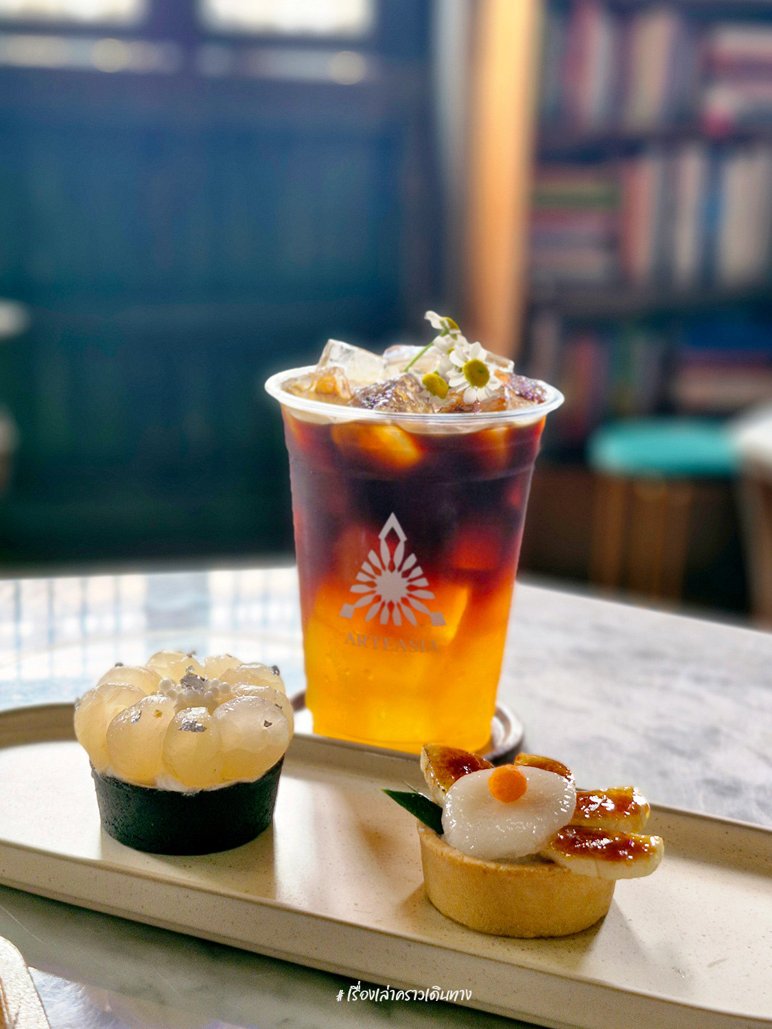 ร้านเครื่องดื่มและของหวานที่ซ่อนตัวอยู่บนชั้น 2 ของตึกผลไม้ มาลองชิมตามนักชิมปิ่นโตเถาเล็ก กับขนมต่างๆที่จับขนมไทยมาใส่ขนมฝรั่ง คือการนำของหวานแบบไทยใส่ลงบนทาร์ต(Tart) ชิ้นเล็กๆน่ารัก ไปยืนเลือกดูจากตู้กระจกที่มีป้ายบอกคำอธิบายไว้พอเข่าใจเช่น Mayongchid: ทาร์ตมะยงชิดบนข้าวเหนียวใบเตยกับคาราเมลอบเชยและครีมชีสมะพร้าว หรือ Golden Drops: ทาร์ตสาคู+แห้วและมูสกะทิตกแต่งด้วยทองหยอดเม็ดเล็กจิ๋วๆ อยากชิมหลายอย่าง แต่มาคนเดียวเลยสั่งแค่ 2 ชิ้น เลือก Piak Lamyai ที่เป็นทาร์ตลำไยลอยแก้ววางบนมูสกลิ่นมะลิโรยด้วยเม็ดเล็กๆของคาเวียร์มะพร้าว กับ Going Bananas คือทาร์ตชิ้นเล็กกับกล้วย 4 ชิ้น รสเค็มหวานคล้ายกล้วยบวชชีและโมจิชิ้นเล็กข้างบน ทั้ง 2 ชิ้นอร่อยพอสมควร แต่ละชิ้นราคาไม่ถูกนัก ให้เป็นค่าความคิด ถ้ามาหลายคนสั่งเป็นชุดมาเลย 5 ชิ้น