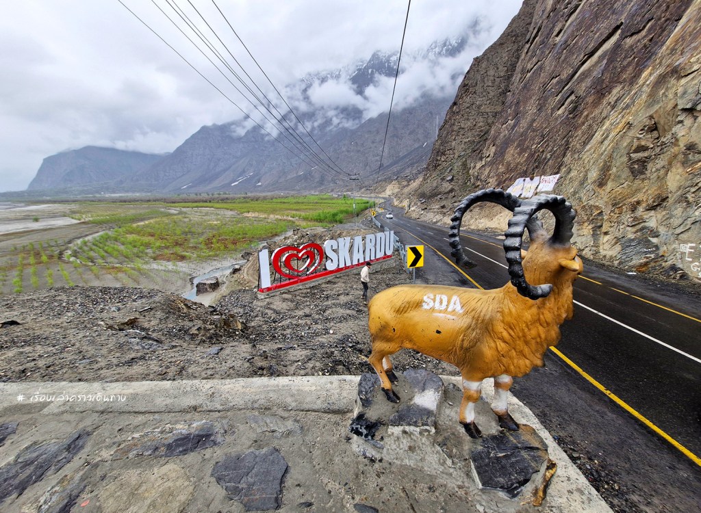ลา Skardu ที่จุดชมวิวทางออกเมือง กับป้าย I 💗 Skardu ที่เหมือนมีไอติมวอลล์เป็นสปอนเซอร์จัดสร้าง กับรูปปั้นเจ้า Ibex เขาโง้ง