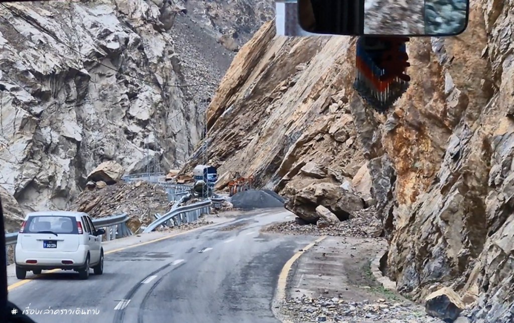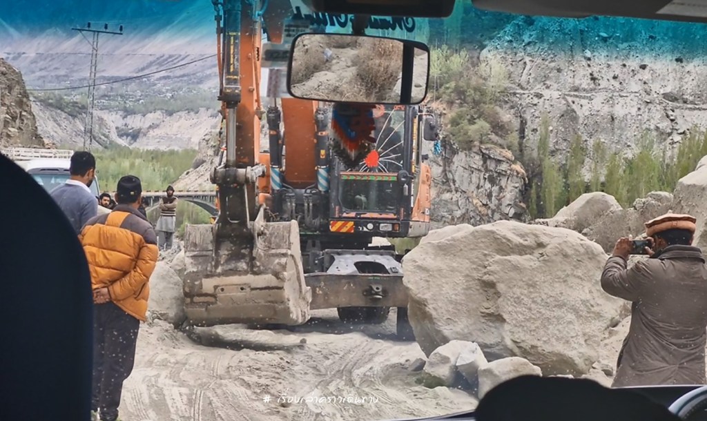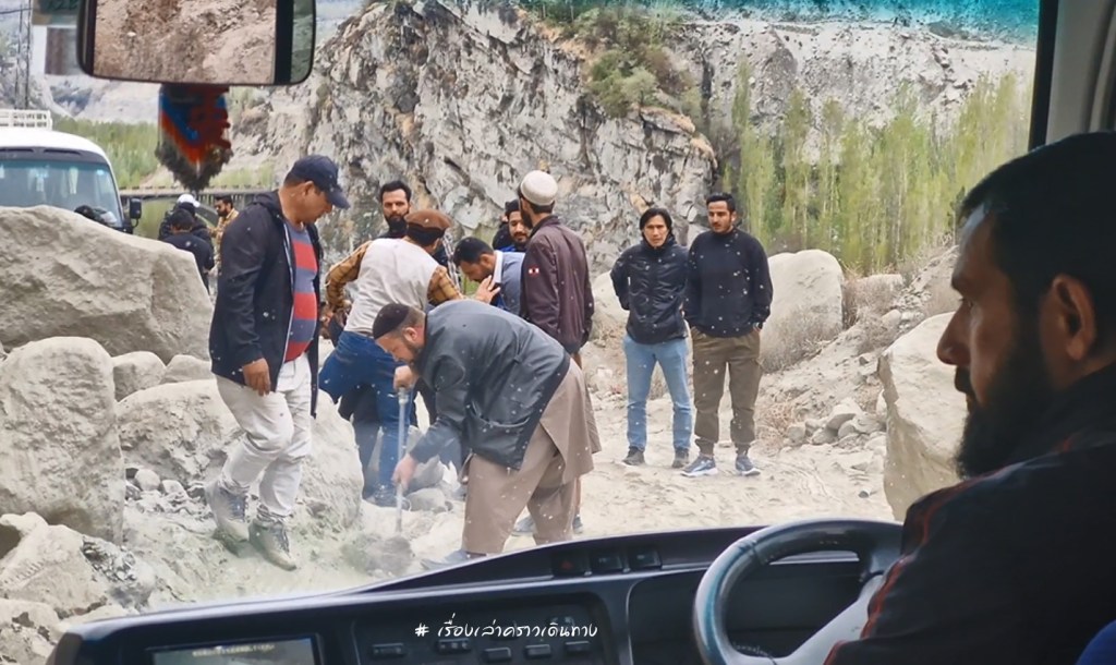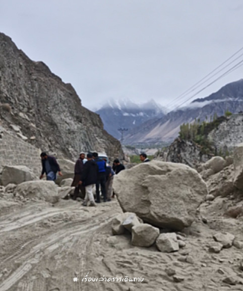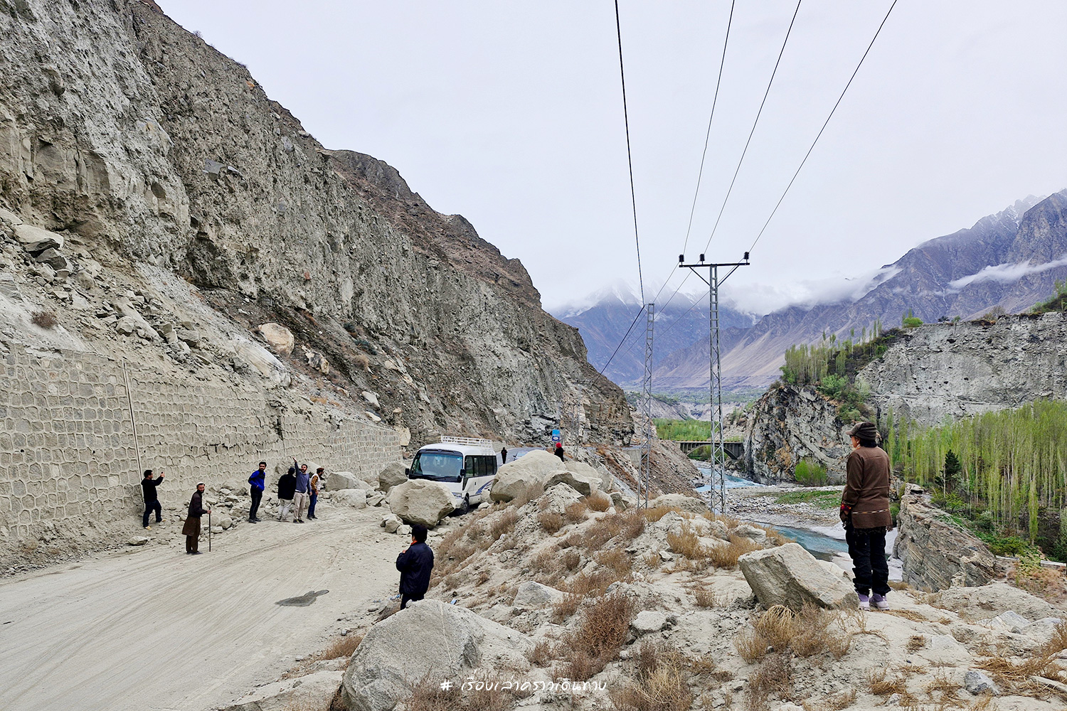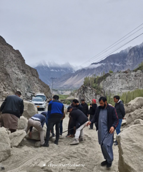 นั่งรถเที่ยวในปากีสถานมีโอกาสเจอ road blocked ได้บ่อยๆ พวกเราก็เจอหินร่วงมาปิดทางจนได้ เป็นช่วงตอนก่อนจะถึง Hunza จากที่เคยอ่านรีวิวก็ได้มาเห็นเหตุการณ์จริงๆ พอเจอทางปิดแต่ละคันจะลงมาช่วยกันพร้อมอุปกรณ์ต่างๆ เช่น ชะแลง คงเจอบ่อยจนรถแต่ละคันมีเครื่องมือใช้งานได้เลย คือถ้าเป็นหินก้อนไม่ใหญ่มากก็จะช่วยกันงัดๆดันๆพอให้รถเล็กผ่านได้ ไม่นั่งรอให้รถใหญ่มาช่วย แต่ถ้าเป็นก้อนใหญ่มาก ขยับเองไม่ไหว ก็ต้องนั่งรอเพื่อให้รถใหญ่ เช่นรถแบ็คโฮ มาช้วยจัดการเลื่อนหินและเปิดทาง ซึ่งอาจต้องรอนานหลายชั่วโมง