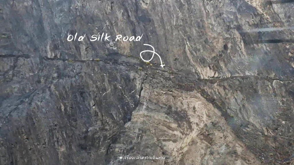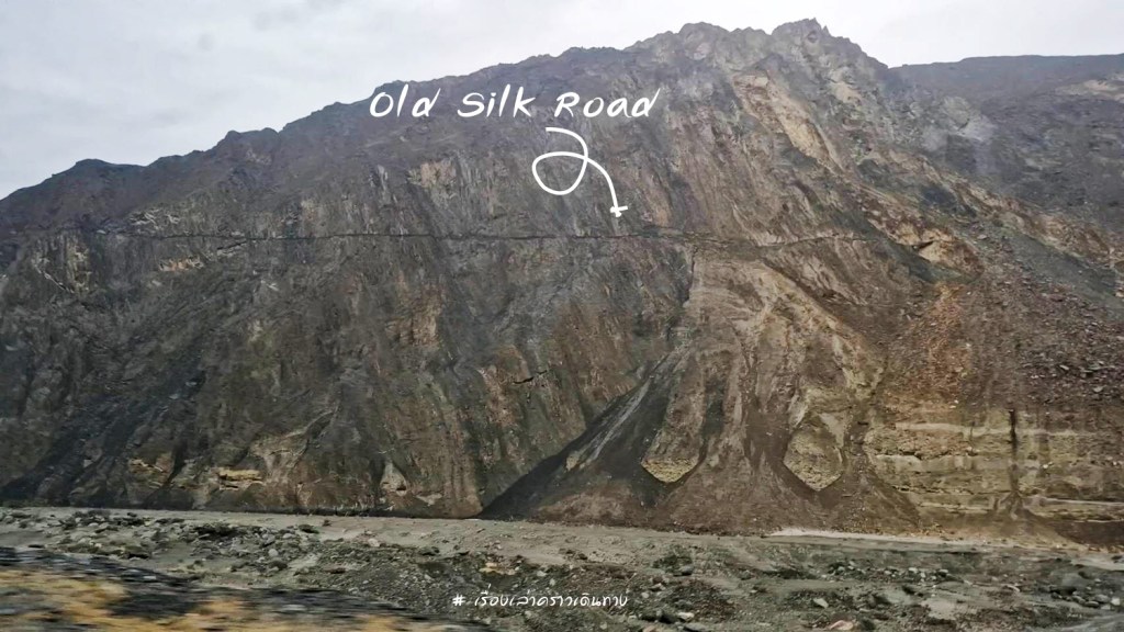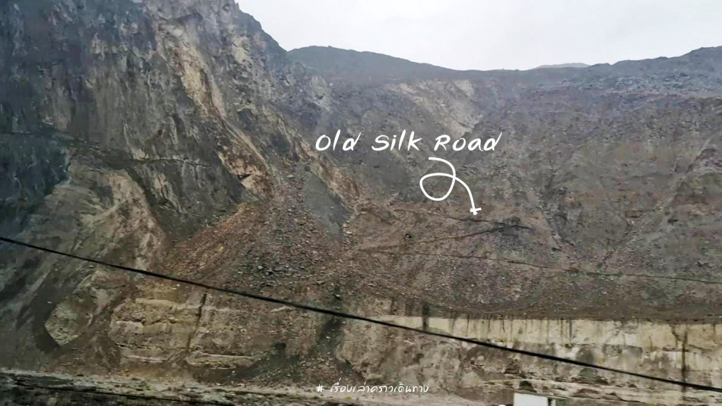 Old Silk Route/Road ออกเดินทางต่อไปบนเส้นทางคาราโครัม มีจุดที่นักท่องเที่ยวส่วนมากมักจอดรถลงไปถ่ายรูปแต่รถเราไม่ได้จอด โชคดีว่ายกมือถือถ่ายคลิปอยู่พอดี ไกด์ที่นั่งข้างๆชี้บอกว่านั่นคือ Old Silk Route/Road ที่มองเห็นเป็นเส้นเล็กๆที่ไหล่เขา ถนนเส้นนี้เป็นเส้นทางการค้าจากจีนไปสู่ยุโรปเมื่อสองพันกว่าปีมาแล้ว โดยมีไหมเป็นสินค้าที่ได้รับความนิยมของราชสำนักยุโรป ถนนเส้นนี้จึงได้ชื่อว่า เส้นทางสายไหม นอกจากเป็นเส้นทางการค้าแล้ว เส้นทางสายไหมยังเป็นเส้นทางเผยแพร่ศาสนาและวัฒนธรรมด้วย หลังการเสื่อมถอยของเส้นทางการค้าเก่าแก่นี้ จีนกลับมาเป็นหัวหอกในการฟื้นฟูและพัฒนาเส้นทางการค้าใหม่อีกครั้ง คาราโครัมไฮเวย์เป็นส่วนหนึ่งของเส้นทางสายไหมยุคใหม่นั่นเอง
