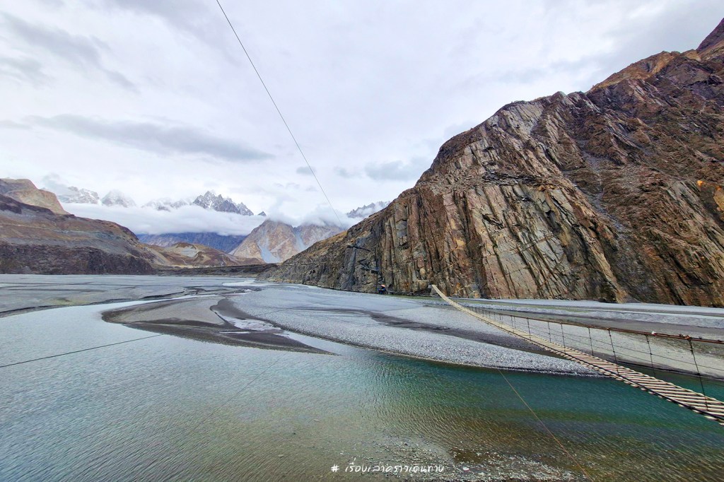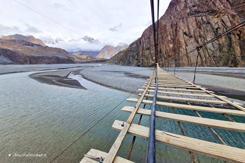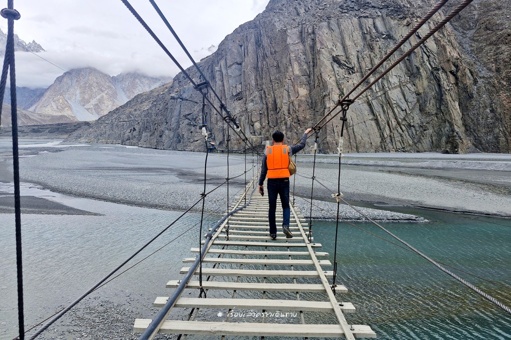 Hussaini Suspension Bridge สะพานแขวนฮุสไซนี่ สะพานแขวนข้ามแม่น้ำฮุนซ่า ที่ว่ากันว่าเป็นสะพานแขวนที่อันตรายเพราะหากเดินไม่ระวังก็พร้อมจะร่วงลงระหว่างแผ่นไม้ของสะพานได้ทันที แต่ดูแล้วคนน่าจะร่วงแค่ขาถ้าไม่ตัวเล็กจริงคงจะติดคาแผ่นไม้แหละ แต่กล้องหรือมือถือถ้าถ่ายรูปแบบไม่ระวังก็พร้อมร่วงแน่นอน การจะเดินออกไปที่กลางสะพานหรือจะเดินไปจนสุดสะพาน เพื่อความปลอดภัยเขาจะมีเสื้อชูชีพสีส้มแบบลงเรือให้ใส่ แต่ตอนที่พวกเราไปมันดูไม่น่ากลัวเท่าไหร่ เพราะน้ำในแม่น้ำค่อนข้างแห้ง ตกลงไปคงไม่จมน้ำแต่คงขาหักหรือคอหัก