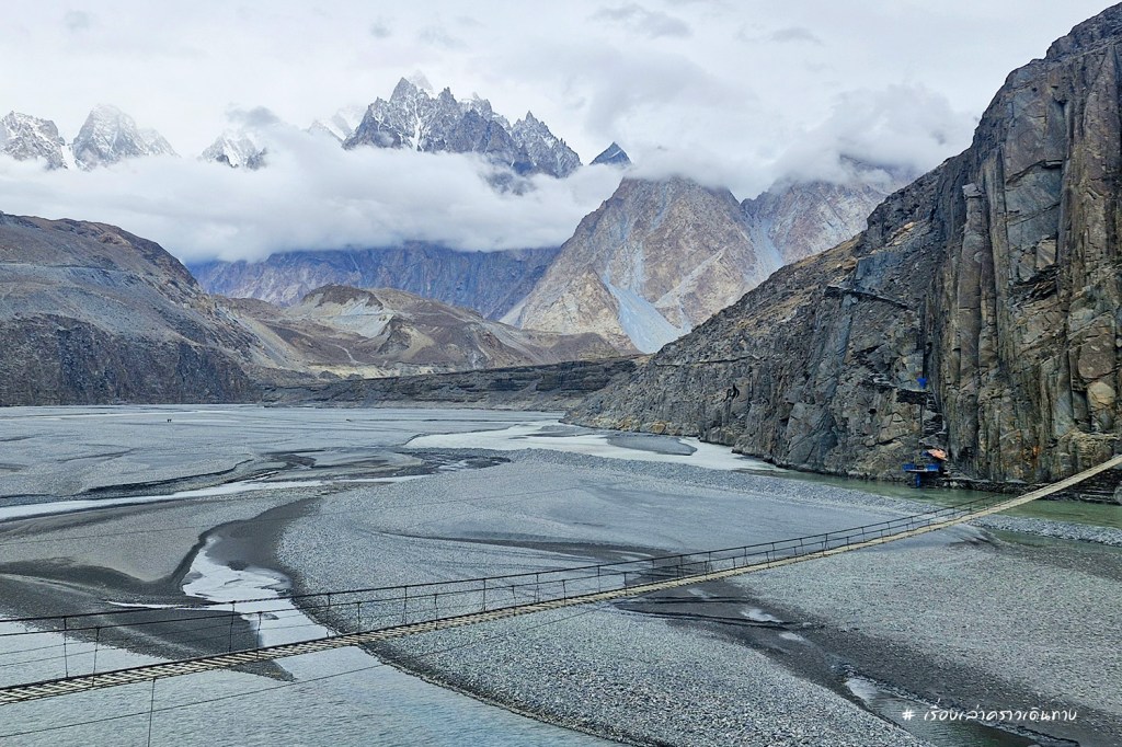 Hussaini Suspension Bridge กับฉากหลังของ Passu Peak