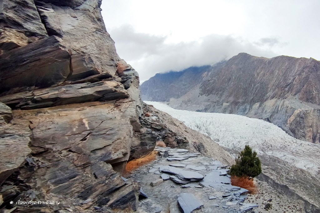 Passu Glacier เป็นธารน้ำแข็งที่ไหลลงมาจาก Passu Peak หรือยอดเขาพาสสุนั่นแหละ แต่กลายเป็นธารน้ำแข็งสีขาวสวย ทางเดินมีขึ้นเขาช่วงแรกแต่ไม่ได้สูงชันมากนัก ใครมีไม้เทรคคิ้งด้วยก็ดี ไม่มีก็ไหวแหละ ขึ้นเขามาแล้วจากนั้นส่วนมากจะเป็นทางเดินเลาะเลียบเขาไป รวมเวลาเดินประมาณ 20-30 นาทีก็ไปได้ใกล้ธารน้ำแข็งแล้ว ยังมีทางเดินขึ้นเขาไปได้อีกเรื่อยๆ แต่พวกเราเอาแค่ตรงที่มาถึงข้างๆธารน้ำแข็งส่วนล่างก็พอ ไกด์เล่าว่าตอนเขาเด็กๆธารน้ำแข็งยาวลงไปถึงด้านล่าง คือแทบไม่ต้องไต่เขาขึ้นมาก็ได้ใกล้ชิดธารน้ำแข็งแล้ว โลกร้อนทำให้ธารน้ำแข็งละลายไปเยอะมาก ต่อไปใครจะเดินมาที่ธารน้ำแข็งนี่ก็คงต้องเดินไกลขึ้นทุกปี