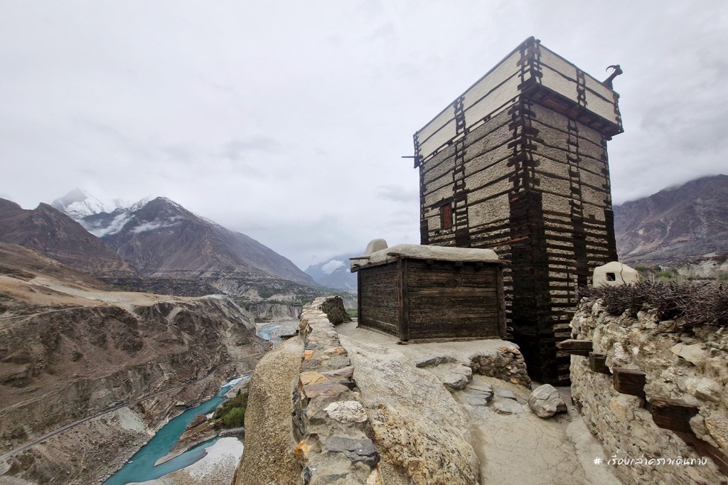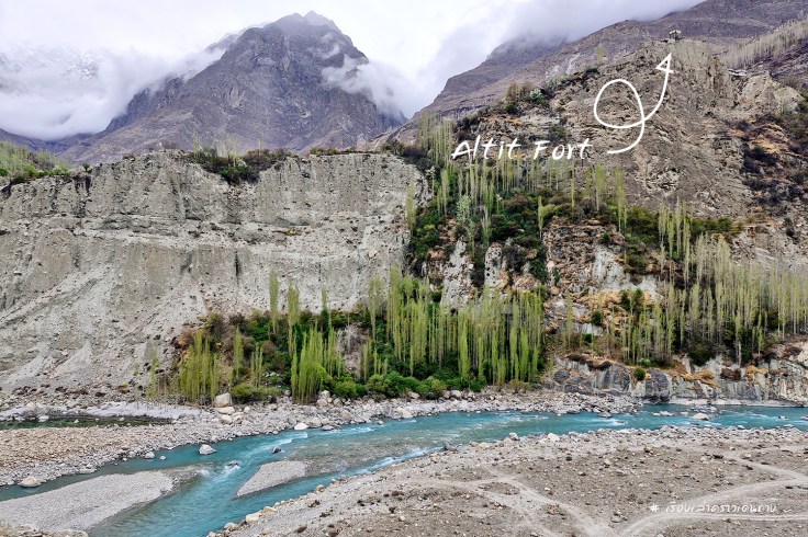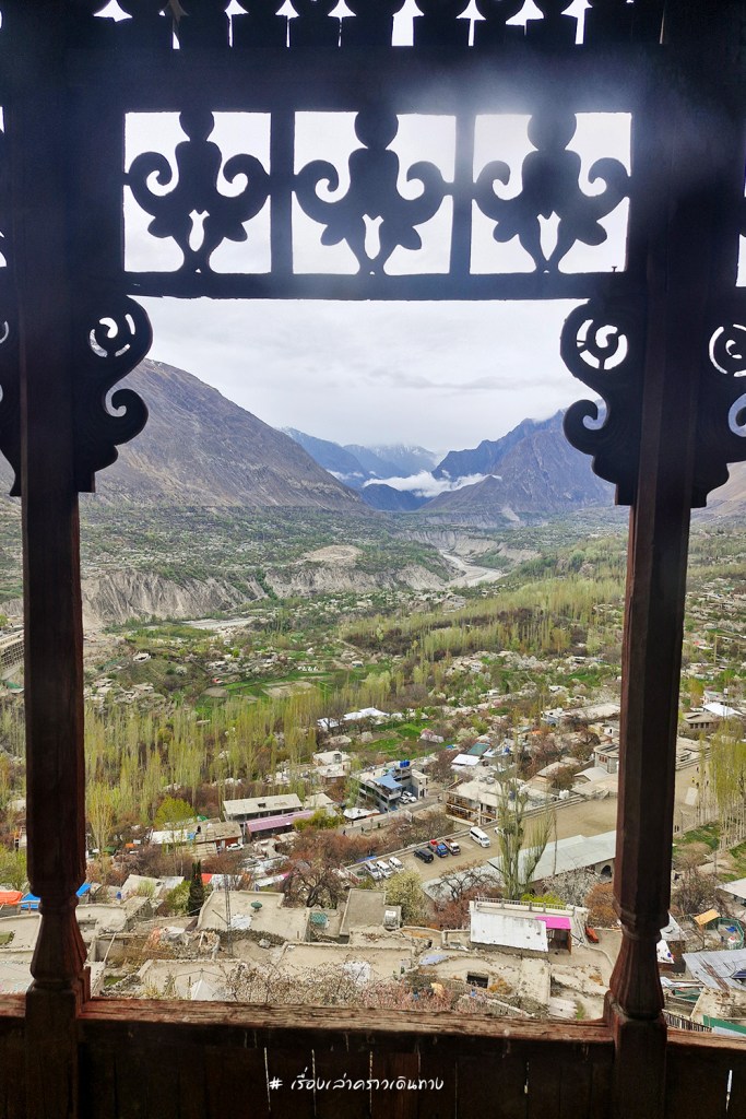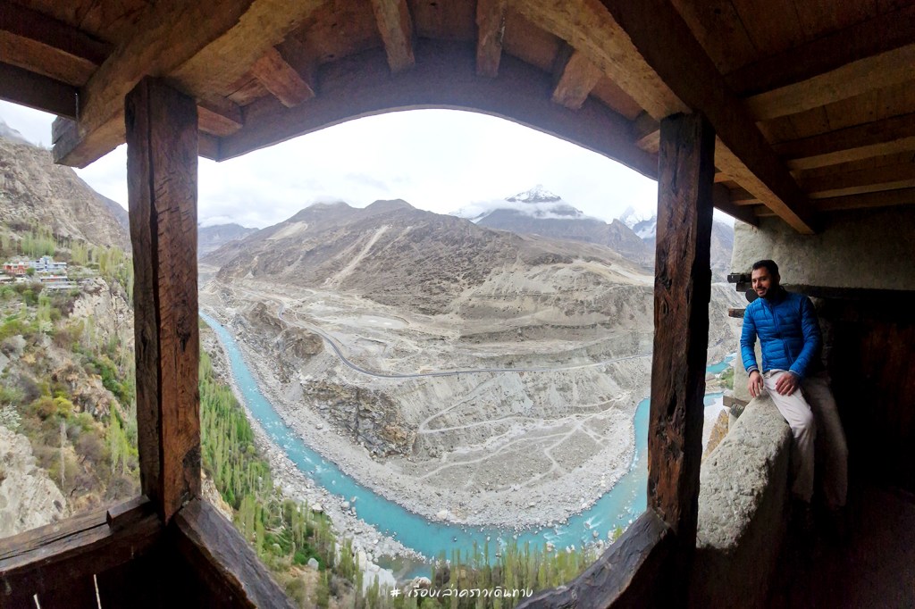 วิวของ Altit Fort สวยตรงที่มองเห็นแม่น้ำฮุนซ่าสีสวยด้านล่าง และคาราโครัมไฮเวย์ เห็นจุดหินถล่มที่เราติดอยู่ได้เลย