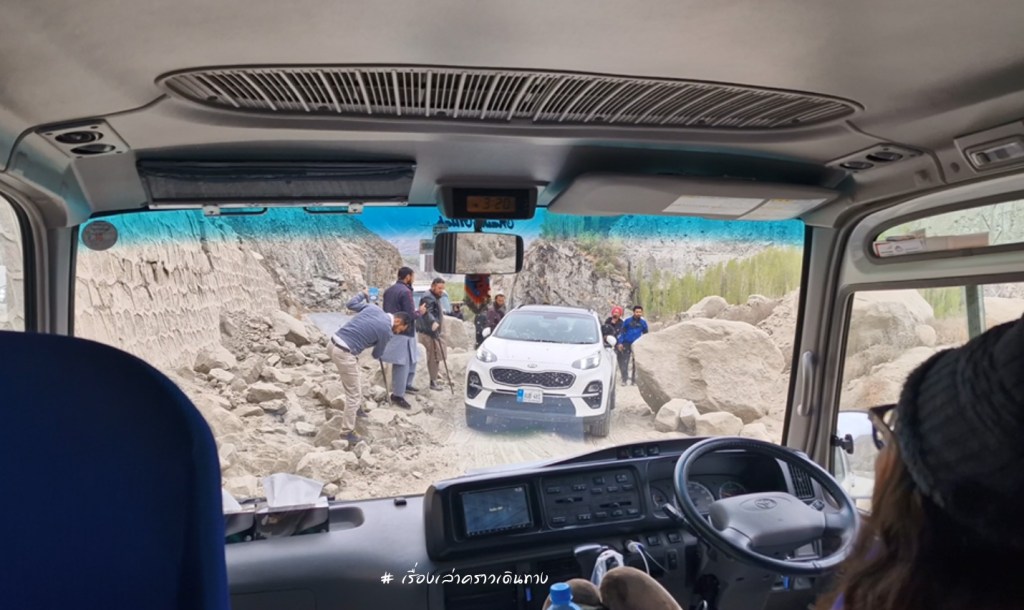 พวกเราถือว่าโชคดีมาก เพราะหินที่ลงมาก้อนไม่ใหญ่ก็จริง ช่วยกันขยับจนรถเล็กผ่านไปได้หลายคัน แต่รถมินิบัสของเรายังผ่านไม่ได้ แต่ด้วยว่าห่างจากตัวเมืองฮุนซ่านิดเดียว รถช่วยเหลือเลยออกมาถึงเร็ว มาถึงก็เอาแขนยื่นมาจัดการเลื่อนหินออกนิดเดียว พวกเราก็ผ่านได้ ก็เลยไปเที่ยวต่อได้ตามแผน