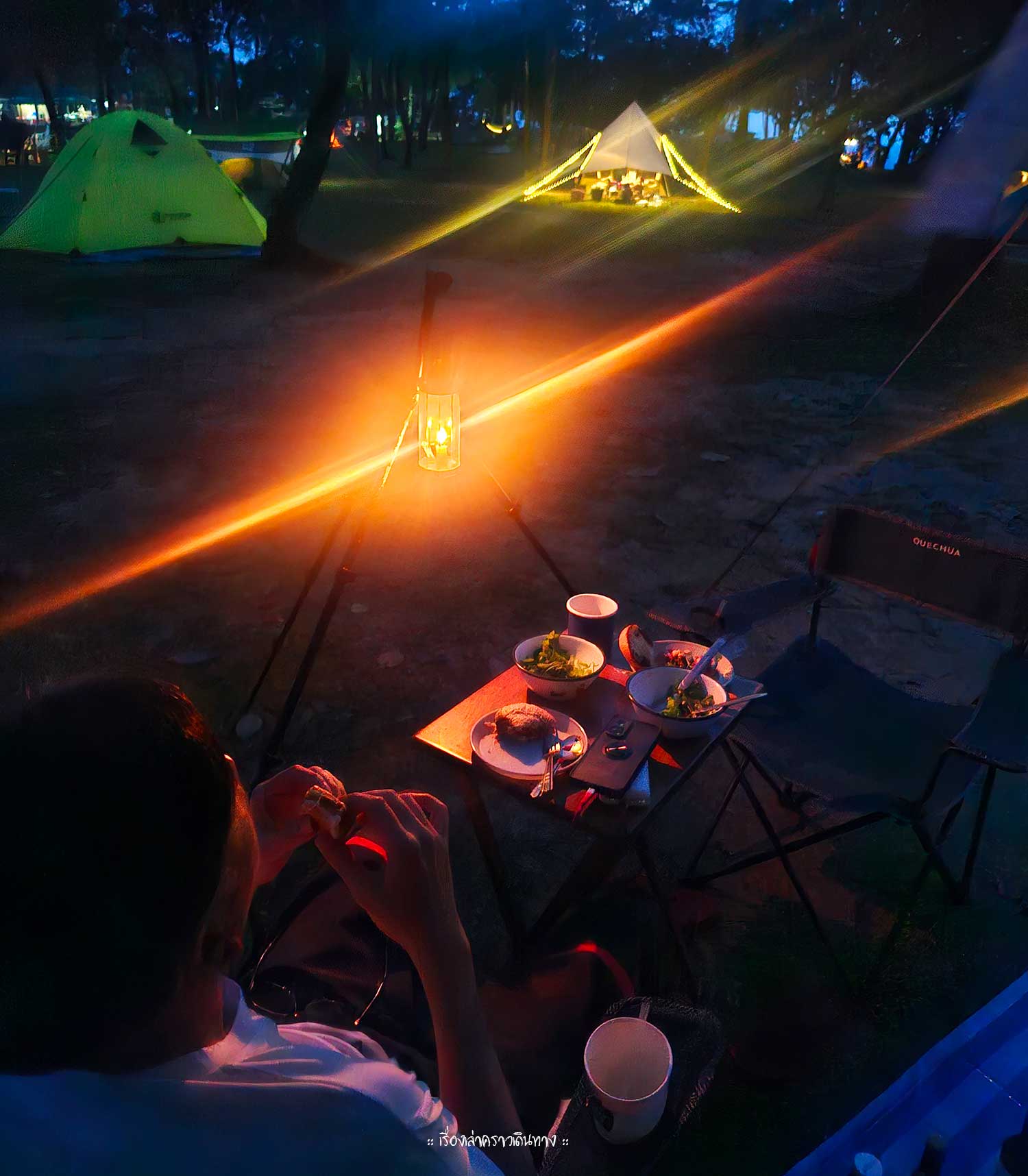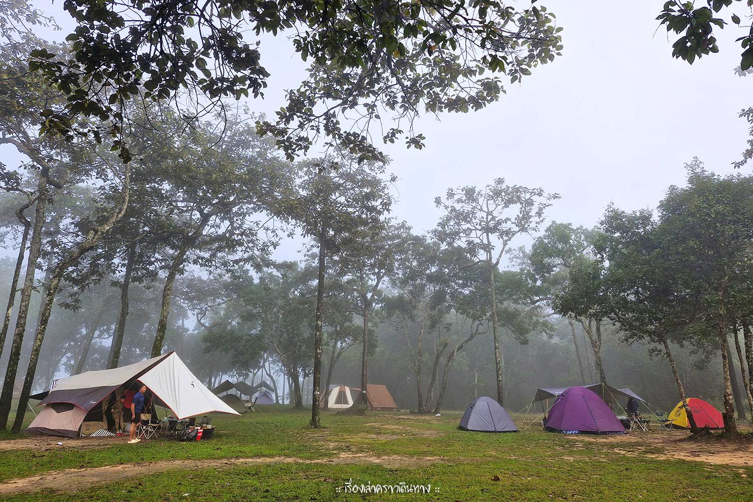 กลางคืนอากาศดีมากๆประมาณ 20 องศา พอกินอาหารเย็นเสร็จเก็บข้าวของยังไม่ทันเรียบร้อยฝนก็ถล่มลงมา ทำให้ตอนเช้าหมอกฟุ้งไปทั้งลาน