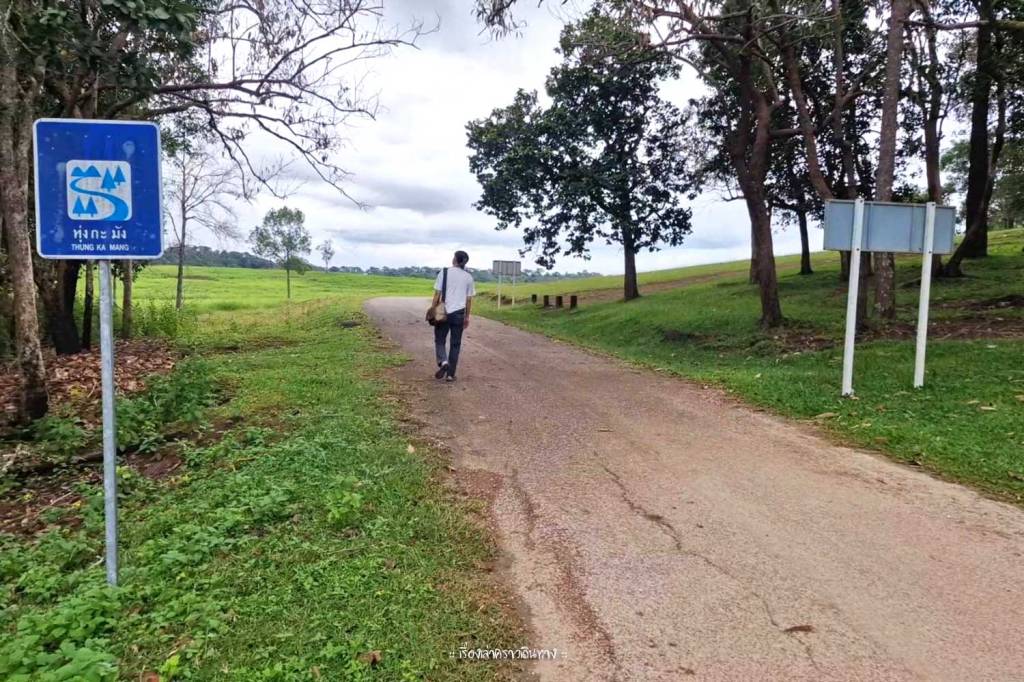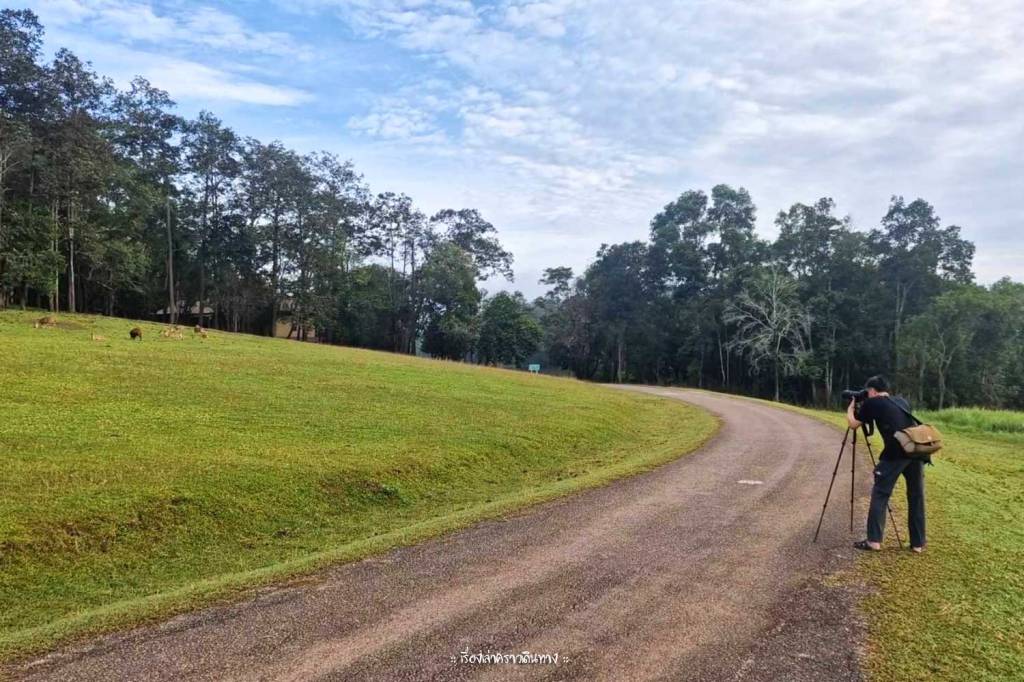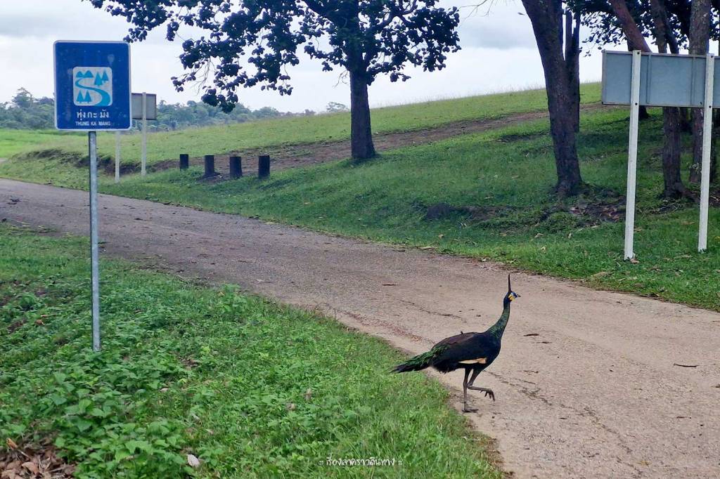 ตรงเรือนพักนี้ห่างจากทุ่งกะมังอีกประมาณ 1 กม. ตอนเย็นเราเลยเดินเล่นไปตามถนน อากาศดี เจอนกยูงเดินอยู่ริมทาง เมื่อเลี้ยวโค้งเข้าสู่พื้นที่ทุ่งกะมังมองเห็นน้องเนื้อทรายอยู่ไกลๆ
