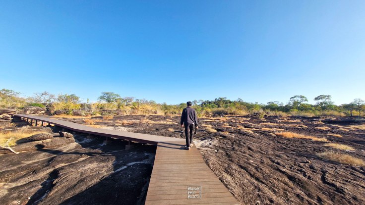 ทางไปผาชะนะไดทำทางเดินไม้ไว้ดีมากๆ ชนิดว่าคนนั่งรถเข็นก็มาได้นะ ทางเดิน 800 ม. ถึงผาชะนะได เดินเรื่อยๆเปื่อยๆ 15 นาทีถึง แล้วเดินวนไปทางศาลาชมวิวดูผากำปั่น แล้ววนกลับลานกางเต๊นท์ รวมระยะทางประมาณ 1.5 กม. ความจริงมีน้ำตกห้วยพอกให้เดินไปเที่ยวได้อีก แต่ตอนนี้แล้งสุดๆ จนท.บอกว่าไม่มีน้ำเลย ไม่คุ้มเหนื่อย ไม่ต้องไป