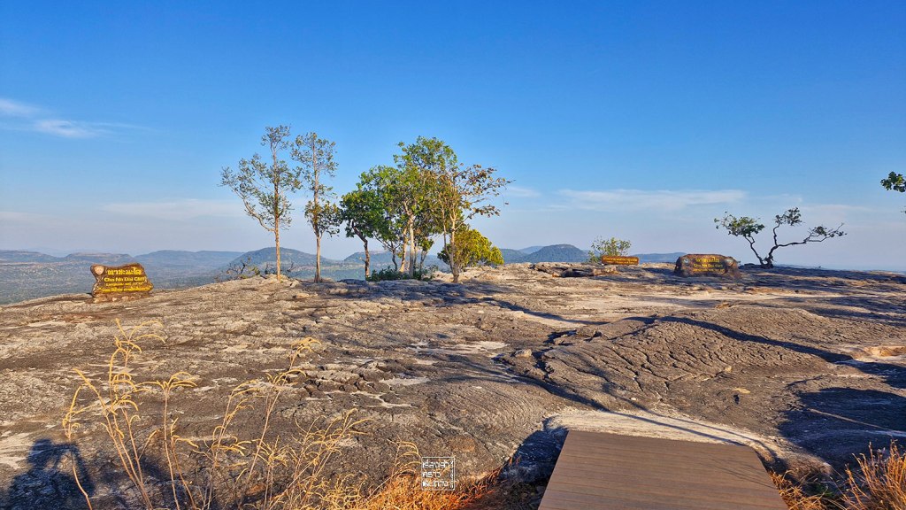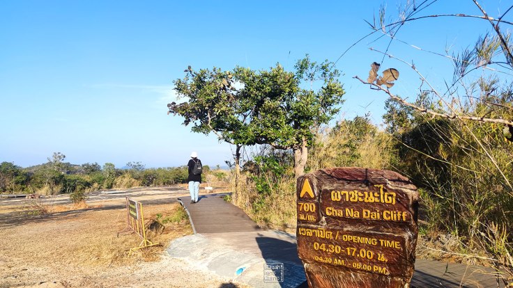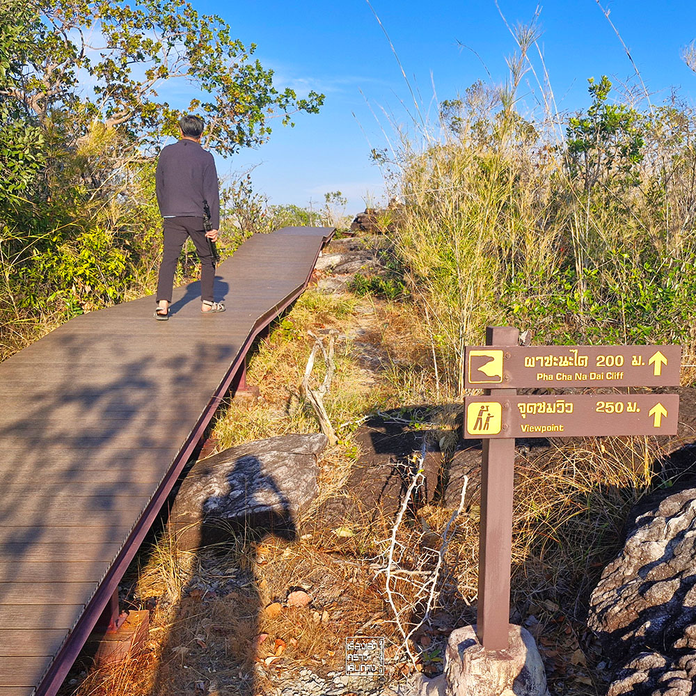 บ่ายแก่ๆออกไปเดินเล่นกันหน่อย ความจริงแล้วจากจุดนี้ สามารถเดินเทรลไปเสาเฉลียงคู่ และไปถึงหินเต่าชมจันทร์ก็ได้ ระยะทางประมาณ 4 กม. ไปกลับก็ 8 นะ ใครชอบเดินก็ไม่ต้องแวะตามรายทางมาเดินเอาก็ได้ แต่เราแวะเที่ยวมาหมดแล้ว เลยเลือกเดินไปชมผาชะนะไดยามเย็น เป็นการประเมินเวลาในการเดินด้วย ตอนเช้าจะได้ไม่ต้องรีบ