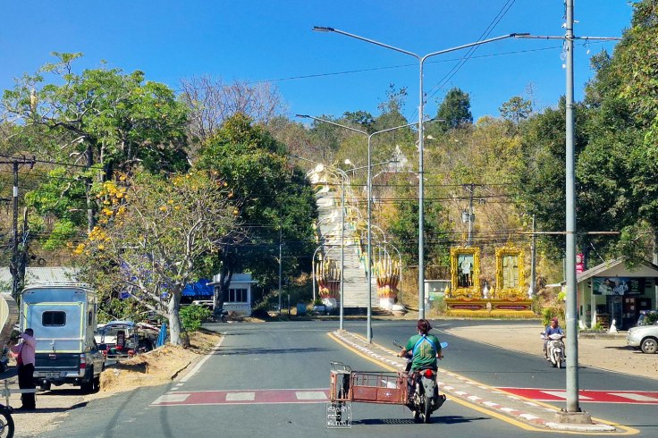 บันไดสวรรค์ จุดชมวิวเมืองโขงเจียม บันได 184 ขั้นจากริมถนนขึ้นไปด้านบน จะเห็นภาพมุมกว้างของเมืองโขงเจียมและแม่น้ำสองสีได้มองขึ้นไปเห็นมีพระพุทธรูปองค์โตอยู่ด้วย ทางขึ้นบันไดเป็นรูปพญานาค 7 เศียรทั้งสองข้าง มีแนวลำตัวทอดยาวขึ้นไปเป็นราวบันได ทางขึ้นอยู่ติดกับเทศบาลบ้านด่าน อบต.โขงเจียม เราไม่ได้ขึ้นเพราะความขี้เกียจล้วนๆ