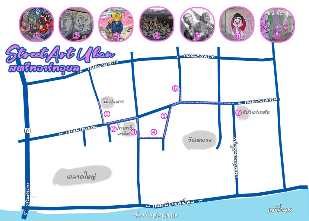“อุบลราชธานี”นับเป็นหนึ่งในเมืองฮิปๆชิคๆของไทยในยุคสมัยนี้ เมื่อเป็นเมืองฮิปๆชิคๆก็ต้องมีงานศิลปะให้ได้เสพย์ อุบลราชธานีมีโครงการส่งเสริมการท่องเที่ยวด้วยงานศิลปะ กับโครงการ “อุบลสตรีทอาร์ตโปรเจค” (Ubon Street art Project) คือ ภาพเขียนบนฝาผนังของอาคาร ที่เราๆเรียกทับศัพท์กันว่า สตรีทอาร์ท