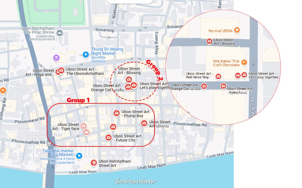 ส่วนสตรีทอาร์ทกลุ่มนอร์มอลคาเฟ่จะห่างจากสตรีทอาร์จุดที่ 7 ออกไปอีกประมาณ 200 เมตร (จากร้านกาแฟส่งสารไป 400 เมตร) ไปถึงบริเวณนั้นแล้วสตรีทอาร์ทจะอยู่ติดๆกัน ทำแผนที่ไว้แต่ยังไม่ได้ไป ใครมีเวลาก็เดินเก็บทั้งหมดได้เลยทั้ง 2 กลุ่ม เพราะไม่ได้ไกลกัน ตอนขับรถผ่านถนนบริเวณกลุ่มที่ 2 นอกจากสตรีทอาร์ทแล้ว เห็นยังมีบ้านเรือนแถวเก่าๆอยู่เยอะ คิดว่าแถบนี้น่าจะใช้เวลาเดินถ่ายรูปมากกว่ากลุ่มแรก ปักหมุดไว้ไปเที่ยวอุบลคราวหน้าจะไปเดินดู