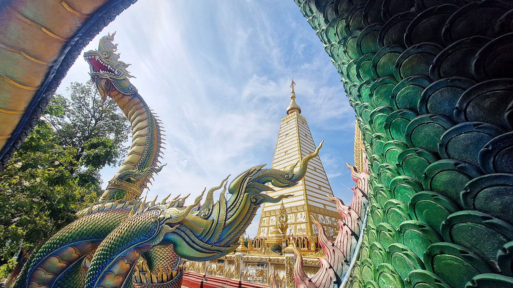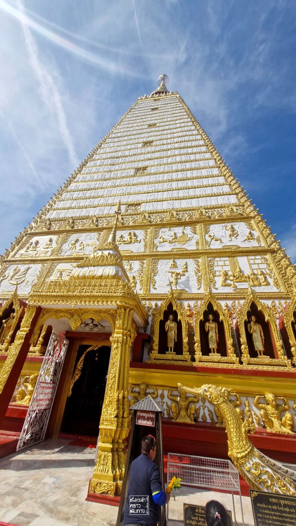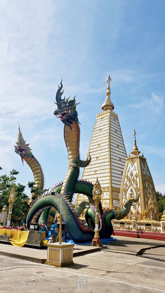 วัดนี้เคยมาแล้วหลายครั้ง แต่ไม่ได้มาอุบลหลายปีเห็นรูปตามรีวิวว่ามีสร้างพญานาคใหญ่โตสวยงามเพิ่มขึ้นด้านหน้า ต้องขอมาชมสักหน่อย และจะได้เข้าไปกราบไหว้องค์พระธาตุเจดีย์ศรีมหาโพธิ์เอาฤกษ์เอาชัยสำหรับทริปแรกของปี องค์พระธาตุเจดีย์สีขาวประดับทอง สูง 56 เมตรจำลองรูปแบบมาจากพุทธคยา ด้านในประดิษฐานพระบรมสารีริกธาตุ องค์พระธาตุเจดีย์ที่เห็นเป็นการสร้างครอบพระธาตุเดิม ตอนหลังเพิ่มเติมทำฉัตรทองคำที่ยอดพระบรมธาตุเจดีย์ เป็นฉัตร 5 ชั้นลงรักปิดทอง ยอดฉัตรรูปดอกบัวตูมเป็นเนื้อทองคำแท้หนัก 31 บาท ตาม พ.ศ.ที่จะยก (ยกฉัตรในปี พ.ศ.2531) และเป็นปีที่พระบาทสมเด็จพระเจ้าอยู่หัว มีพระชนม์มายุครบ 5 รอบ