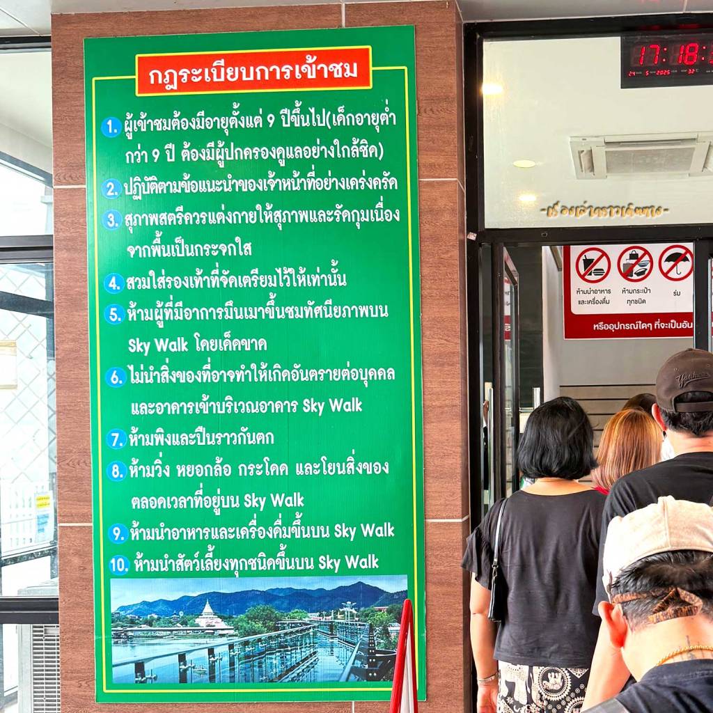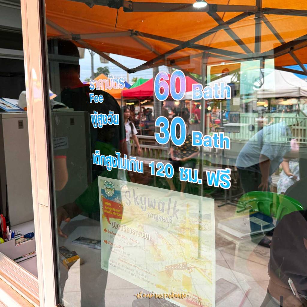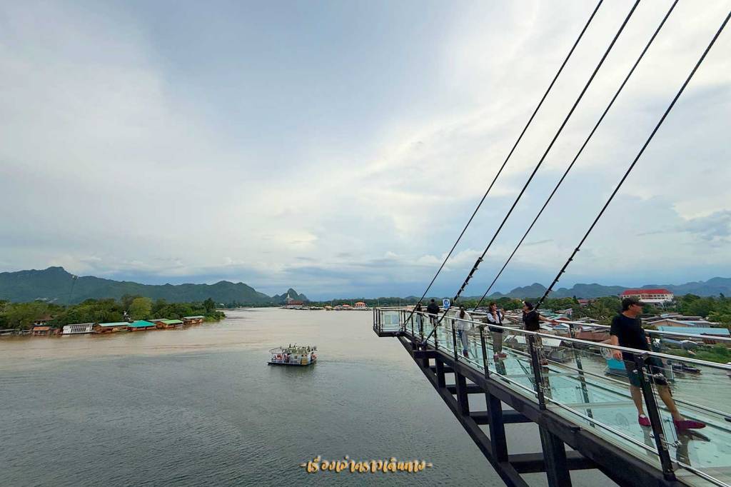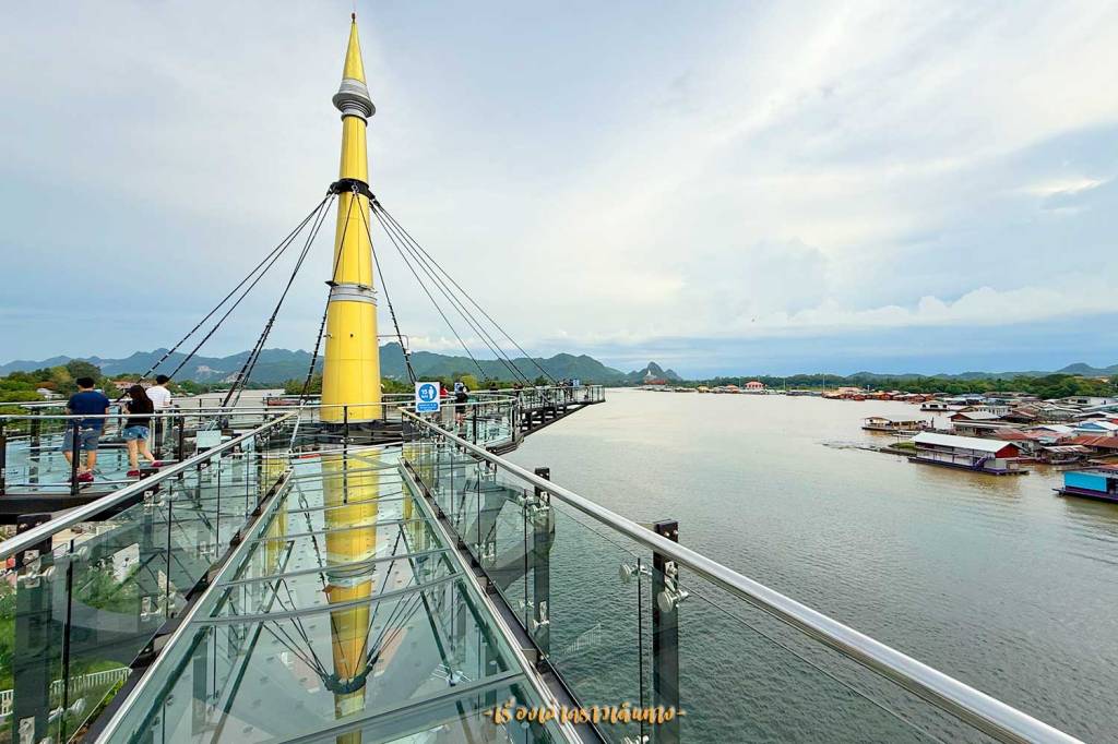 Skywalk Kanchanaburi เป็นจุดชมวิวบริเวณลำน้ำแควใหญ่และแควน้อยไหลมาบรรจบกัน มีความสูง 12 เมตร ยาว 150 เมตร พื้นเป็นกระจกใสตลอดแนวทางเดินยาวเลียบริมน้ำ มีค่าเข้าชม 60 บาท รวมค่าใช้ลิฟต์ขึ้นด้านบน และมีถุงผ้าครอบรองเท้าให้ ซึ่งเอากลับได้เลย (เอากลับมาใช้ครั้งหน้าได้ถ้ามาอีก จ่ายค่าเข้าเหลือแค่ 30 บาท) ก่อนขึ้นลิฟต์ก็เอาถุงผ้าครอบรองเท้าใส่เวลาเดิน (ไม่ต้องถอดรองเท้า) มีกฎระเบียบเรื่องความปลอดภัยง่ายๆ คือ ห้ามปีนป่าย ห้ามวิ่ง ห้ามกระโดด ส่วนที่เป็นระเบียงยื่นออกไปมีป้ายกำหนดจำนวนคนไว้ ก็ช่วยทำตามกฎกันด้วย
