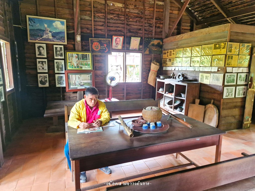 ด้านในบ้านมีลุงคนนึงคอยเล่าเรื่องราวในอดีตให้ฟัง แกว่าแกเป็นรุ่นหลานของเจ้าของบ้าน คือเจ้าของที่ดินนี้เป็นชาวเวียดนามอพยพหนีมาตั้งแต่สมัยฝรั่งเศสยึดครองเวียดนามแล้วโดนกดขี่จนทนไม่ไหว สมัยนั้นมีคนเวียดนามอพยพหนีเข้ามาฝั่งลาว แล้วข้ามเข้าไทยจำนวนมาก มาตั้งรกรากอยู่ตามจังหวัดแนวชายแดน แม้จะหนีมาไทยแต่ท่านเจ้าของบ้านก็เป็นแนวร่วมในการต่อสู้เรียกร้องเอกราชมาตั้งแต่สมัยนั้น ส่วนลุงโฮฯนั้น ได้เข้ามาอาศัยที่นี่ในตอนหลัง มาสร้างบ้านหลังนี้หลบซ่อนอยู่ในพื้นที่ ลุงโฮฯเป็นคนเก่ง ฉลาด เพราะไปเรียนที่ฝรั่งเศสมา ท่านมาอาศัยอยู่ในประเทศไทยราวๆ 7 ปี (พ.ศ. 2466 – 2474) ใช้บ้านเป็นที่ติดต่อประสานงานวางแผนและเคลื่อนไหวการต่อสู้ ต่อมาก่อตั้งกองกำลัง “เวียดมินห์” รวบรวมแนวร่วมเรียกร้องเอกราชให้กับเวียดนามจนสำเร็จ ลุงโฮฯเลยกลายเป็นวีรบุรุษของชาติ บ้านหลังนี้จึงถูกให้ความสำคัญว่าลุงโฮฯเคยมาอยู่ที่นี้
