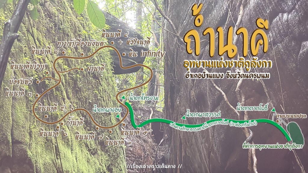 หลังจากปีนป่ายขึ้นถ้ำนาคาฝั่งจังหวัดบึงกาฬไปเมื่อ 3 ปีก่อน [์Naga Trip @บึงกาฬ] ยังตั้งใจไปถ้ำนาคีด้วย แต่ไม่ได้จังหวะเหมาะสักที ก่อนจะแก่จนเดินไม่ไหว ปีนี้จึงไม่รีรอที่จะไป ถือเป็นโอกาสดีกลับไปนครพนมอีกครั้งในปีชงของเรา ไปไหว้พระประจำปีเกิดกันหน่อย จึงเลือกนอนที่จังหวัดนครพนม แล้วขับรถไปที่อุทยานแห่งชาติภูลังกา จุดทางเดินขึ้นถ้ำนาคี ระยะทางราวๆ 100 กิโลเมตร ขับรถประมาณ 1.5 ชั่วโมง