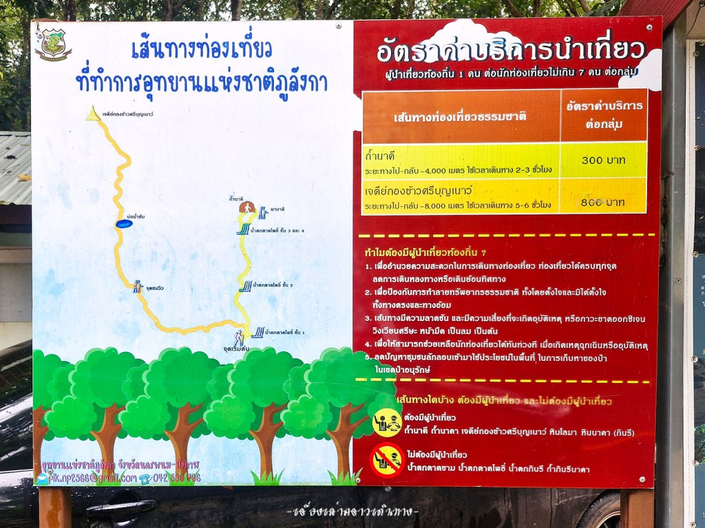 เมื่อเดินทางไปถึงที่ทำการอุทยานแห่งชาติภูลังกา อ.บ้านแพง จ.นครพนม แล้ว ต้องไปลงชื่อเข้าพื้นที่ มีค่าเข้าเขตอุทยานฯคนละ 20 บาท รถยนต์คันละ 30 บาท มีเพิ่มค่าประกันนักท่องเที่ยวอีกคนละ 10 บาทด้วย (ไม่เคยเจอแฮะ) แล้วติอต่อขอคนนำทาง 1 คน เหมือนตอนขึ้นถ้ำนาคา ไม่มีค่าบริการให้สินน้ำใจตามความพอใจตอนกลับลงมาเหมือนกัน (แต่ขอขั้นต่ำ 300 บาทต่อกลุ่ม) ไม่ต้องทำการจองคิวจองเวลาก่อนขึ้น (ถ้าจะไปถ้ำนาคา แนะนำให้จองคิวก่อน เพราะมีจำกัดจำนวนคนต่อวัน)