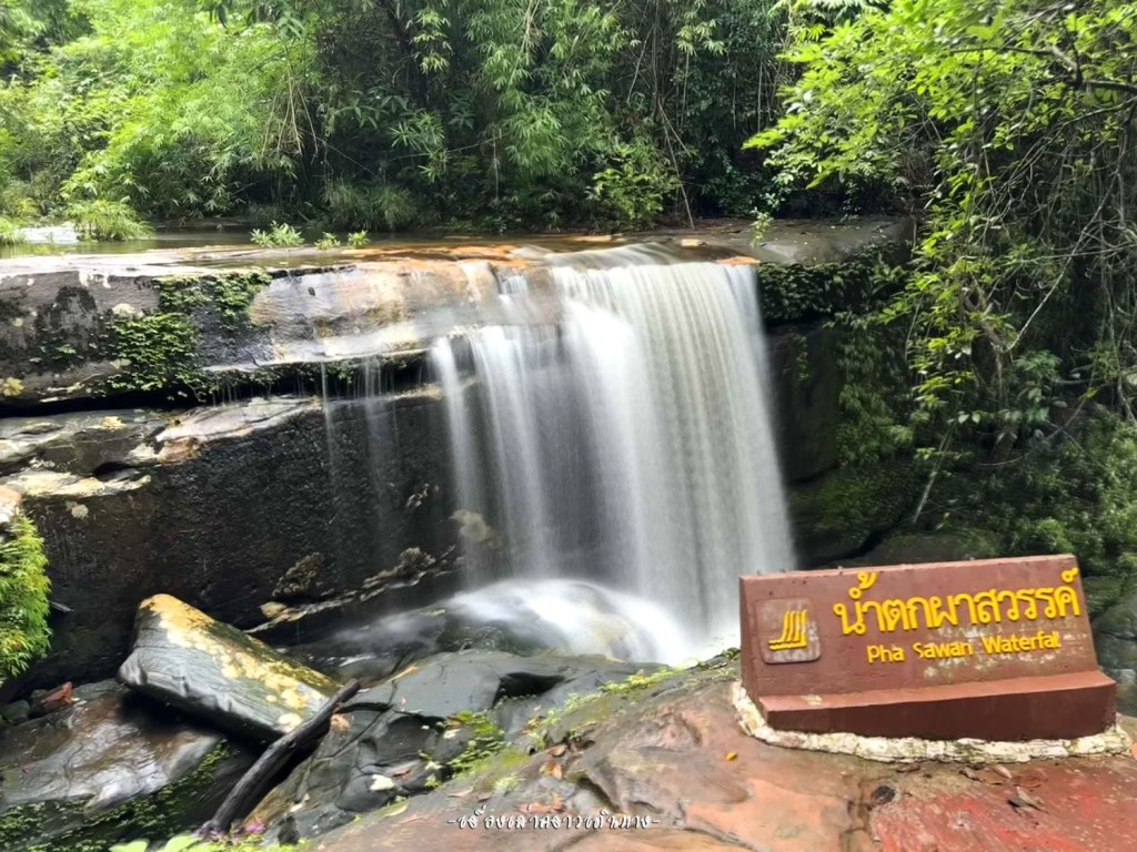 น้ำตกผาสวรรค์ในฤดูฝนเห็นเป็นม่านน้ำสวยงาม ถ้ามาหน้าแล้ง จะมีแต่ผาหิน