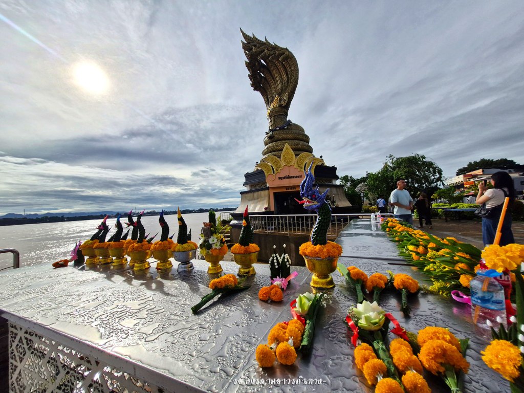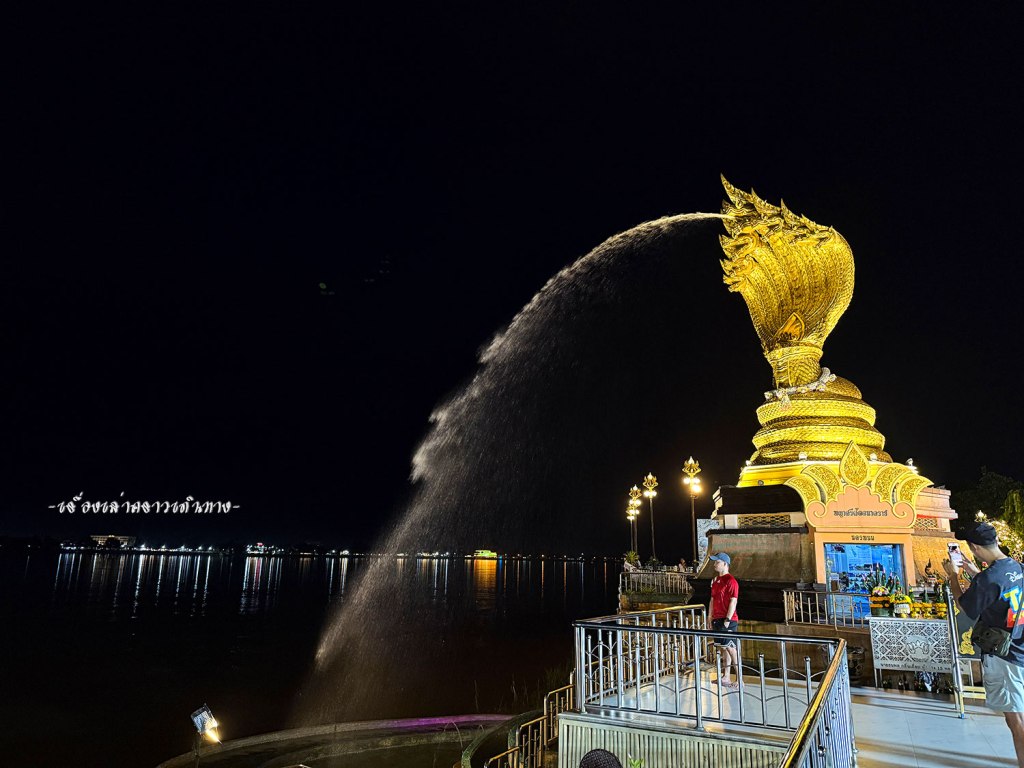 พญาศรีสัตตนาคราช ตอนกลางคืนเปิดไฟแล้วพ่นน้ำด้วย มีคนเข้ามาสักการะตลอดเวลา