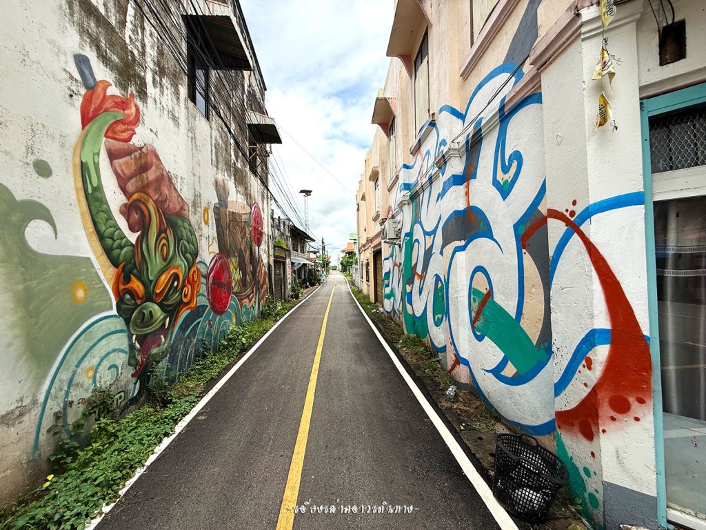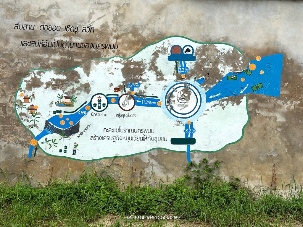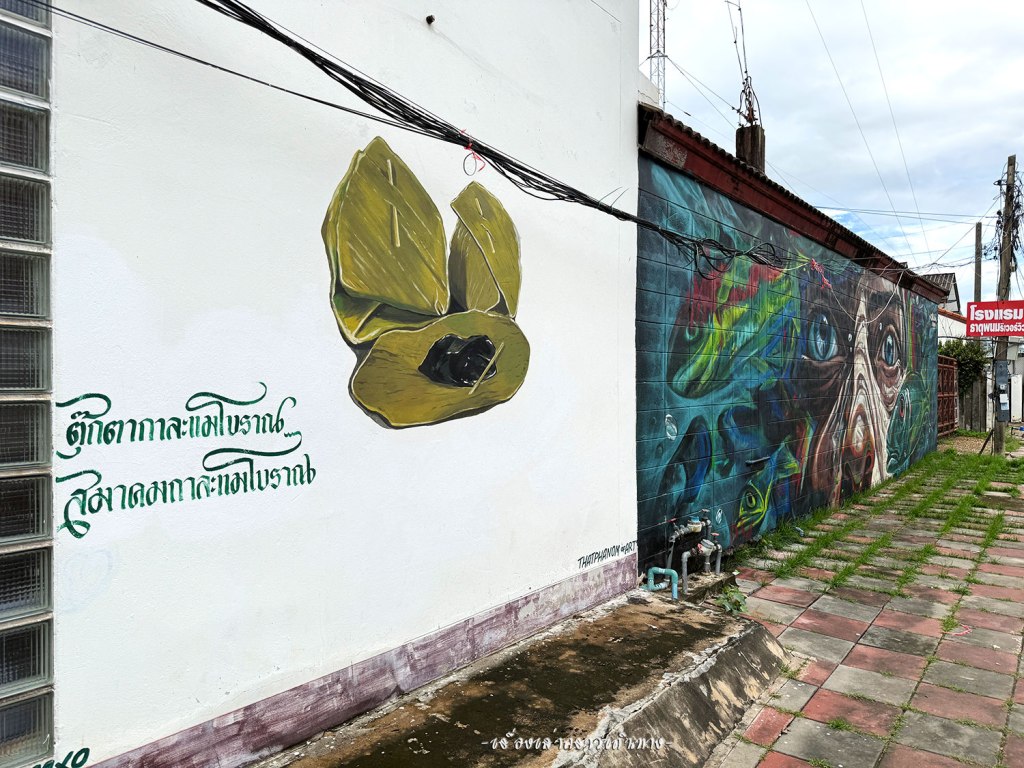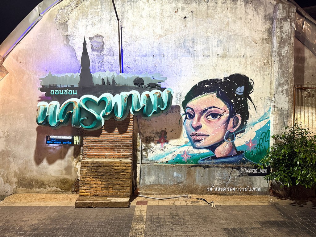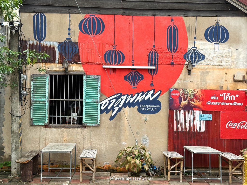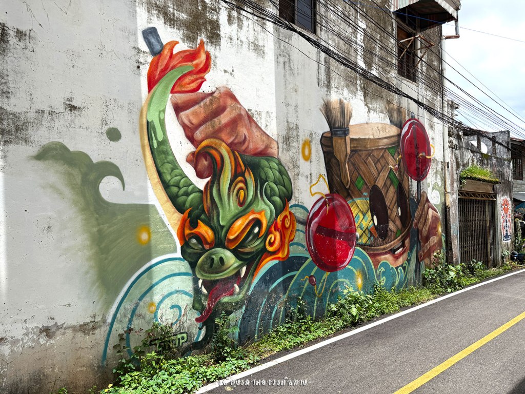 ภาพวาดอยู่บนกำแพงตอนต้นซอยข้างตึกธนาคารเก่า มีรูปไฮไลต์เป็นรูปพญานาคกับหน้าคนสวมกระติ๊บข้าวเหนียวถือป๋องแป๋ง อีกฝั่งเป็นคำว่านครพนม ที่ต้องเพ่งต้องเล็งถอยหลังออกมามองเอาหน่อย