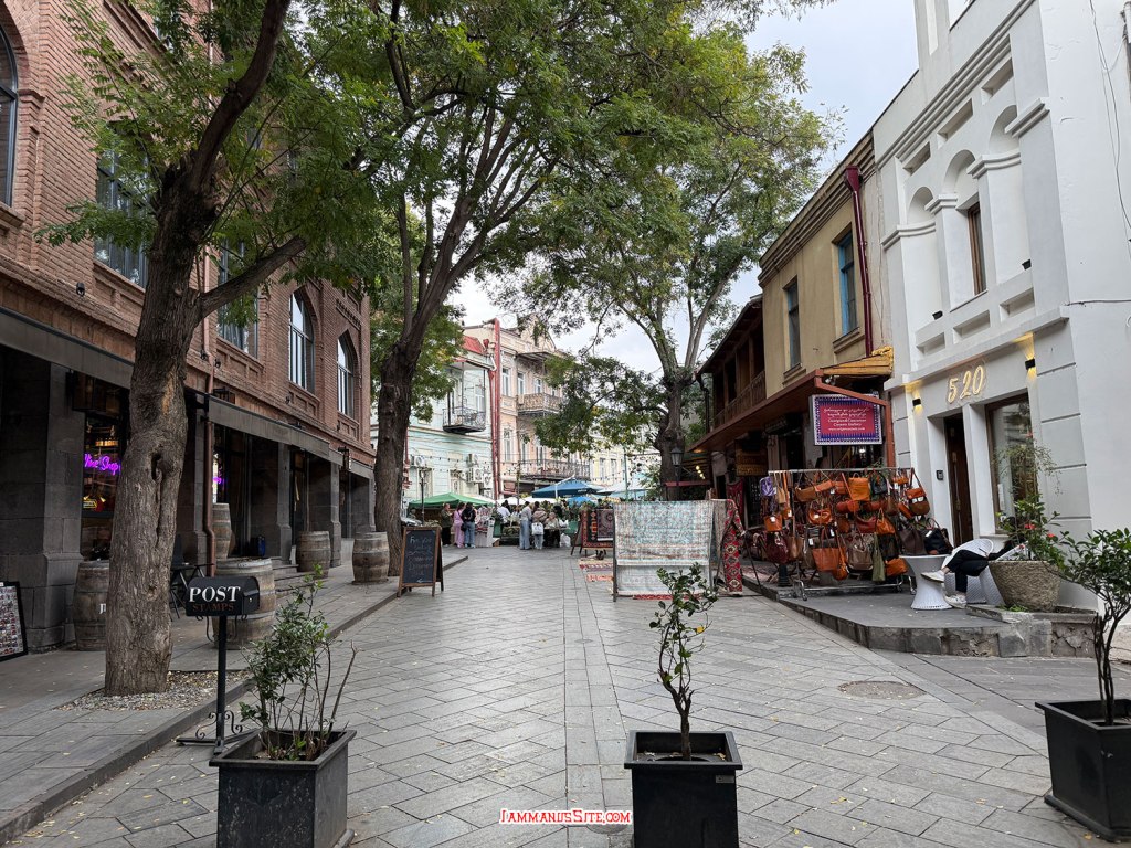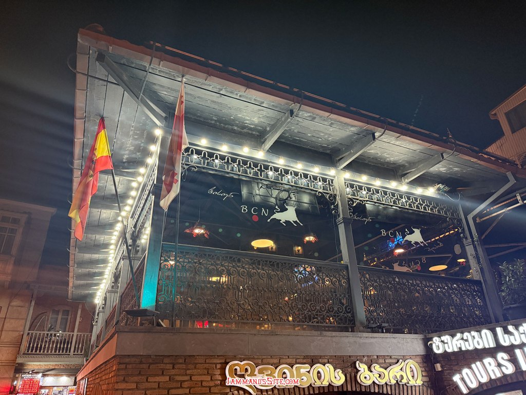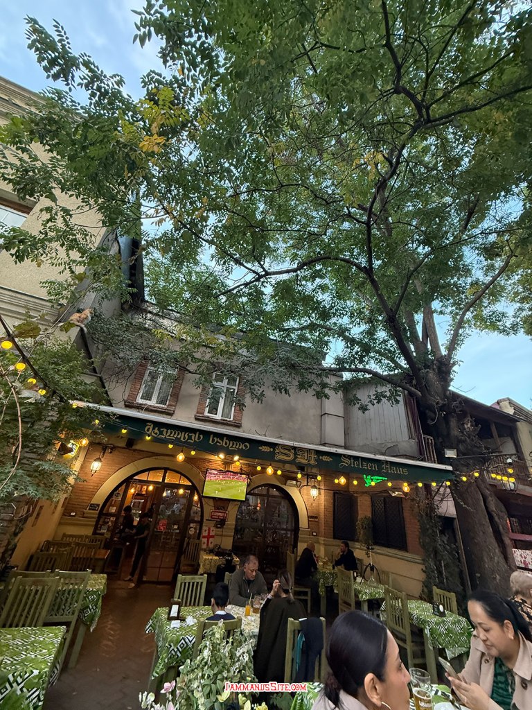 ข้ามจากฝั่งเมืองใหม่กลับไปย่านเมืองเก่า ช่วงเย็นคนคึกคักมาก เดินข้ามสะพานกันไปมา พวกเราเลี้ยวซ้ายเข้าถนน Erekle II ถนนเส้นแคบๆที่มีบ้านสวยตลอดแนว มีระเบียงยื่นออกมาทุกหลัง แต่เปิดเป็นร้านอาหารเรียงรายทั้งถนน แต่ละร้านกางร่มเต็มพรืด เลยถ่ายรูปได้แบบสวยด้านบนมีร่มด้านล่าง