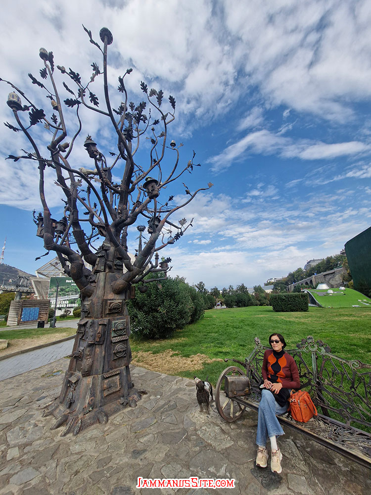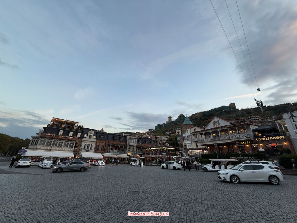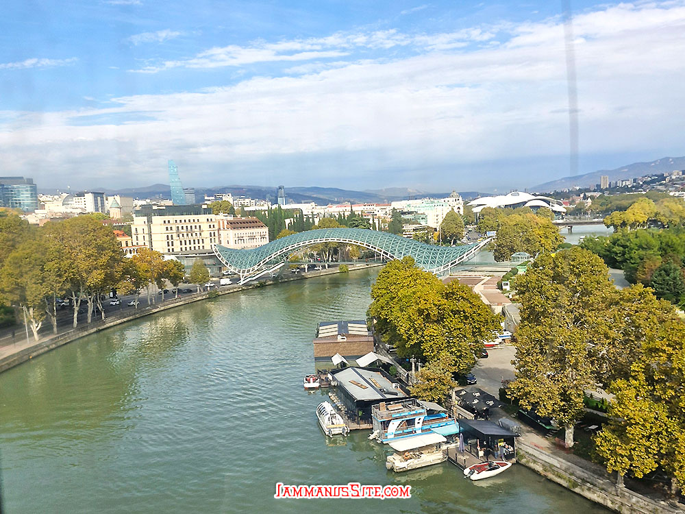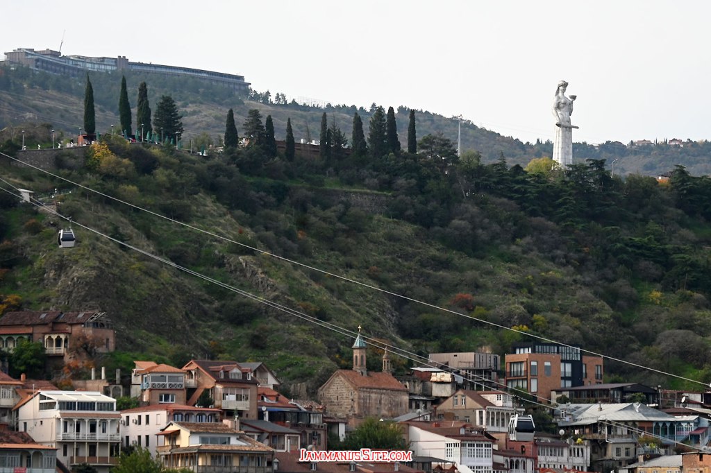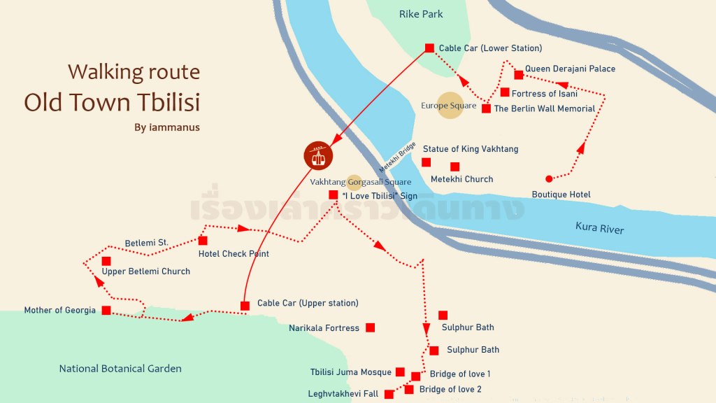 ที่พักของเราอยู่ริมหน้าผาติดแม่น้ำคูรา ใกล้ Metekhi church มาก และแค่เดินข้ามถนนไปก็เป็น Rike Park จุดขึ้นกระเช้าไปยอดเขาที่ตั้ง Mother of Georgia ได้ แผนวันนี้ จะเดินจากโรงแรมไปถ่ายรูปวิวจาก Queen Darejani Palace แล้วไปนั่งกระเช้าขึ้นเขาทักทายพระแม่จอร์เจีย แล้วเดินลงเขามาเดินเล่นย่านเมืองเก่า ระยะเวลาไม่ได้กำหนด เดินตามสบาย ไม่ตรงตามแผนที่วางไว้ที่กะจะเดินลงทาง Narikala Fortress ลงไปตรงโรงอาบน้ำแล้วเดินเล่นลัดเลาะขึ้นไปถึง Liberty Square แต่เนื่องจาก Narikala Fortress ปิดซ่อมแซม ทางลงตรงนั้นก็เลยปิดไปด้วย ก็เลยเดินลงทางพระแม่จอร์เจียแทน แล้วเดินย้อนกลับมาตรงโรงอาบน้ำ ตามแผนเดินนี้เลย ช่วงแรกนี้เดินแค่ประมาณ 2 กม.