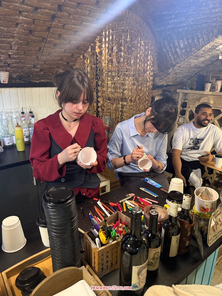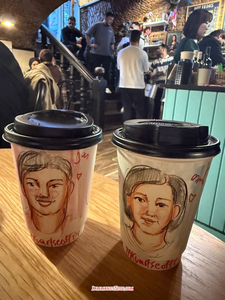 Kvarts Coffee “Coffee with Art” ร้านกาแฟสุดฮิตของนักท่องเที่ยว กาแฟเฉยๆแก้วละ 7-9GEL ถ้าให้วาดรูปด้วยราคา 15GEL ต้องมายืนเป็นแบบให้น้องคนสวยวาด มาตามคิว วาดเสร็จแล้วน้องก็จะถามชื่อ แล้วจะเขียนชื่อเราในภาษาจอร์เจียนให้ด้วย
