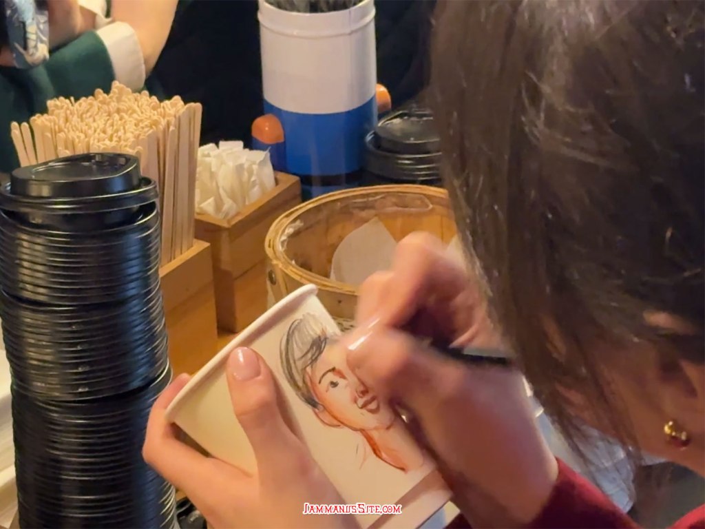 ข้ามเวลาไปถึงตอนกลับมาที่ร้านตามเวลาคิว แต่ก็ต้องรออีกประมาณ 15-20 นาที (ความจริงเอากาแฟมากินก่อนเลยก็ได้ แล้วค่อยเดินกลับมาวาดรูป เพราะยังไงแก้วที่กินกับแก้วที่วาดมันคนละใบกัน แล้วทำไมเราไม่กินก็ไม่รู้ งง ดันรออีก 2 ชม.ตอนเดินกลับมาวาดรูปค่อยเอากาแฟกิน เหอๆ)