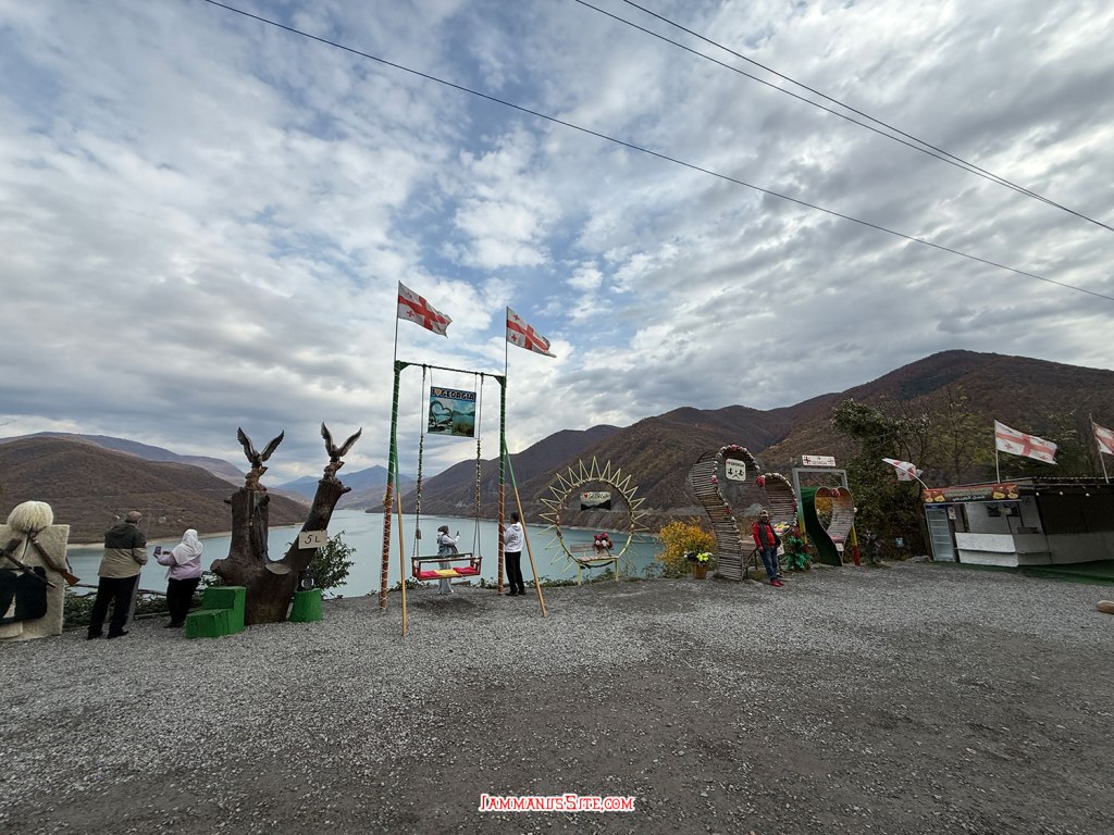 Zhinvali Dam View Point เป็นจุดแวะจอดรถชมวิวทะเลสาบซินวาลีนั่นเอง ตรงจุดที่มีมุมมองได้กว้างและสวย ก็จะมีเพิงขายของอยู่ 2-3 เพิง มีคนมาทำป้าย ทำกรอบ ทำชิงช้า ให้นักท่องเที่ยวถ่ายรูปด้วย แต่เก็บเงินนะ ไม่รู้กี่ GEL แต่มาแค่ถ่ายรูปวิวเฉยๆก็ได้ อารมณ์เหมือนจุดชมวิวเขื่อนลำตะคองบ้านเรานั่นแหละ มีจุดจอดแบบนี้ประมาณ 2-3 จุดที่พอมีลานให้รถจอดได้