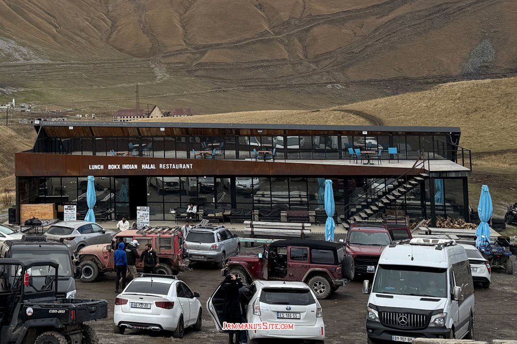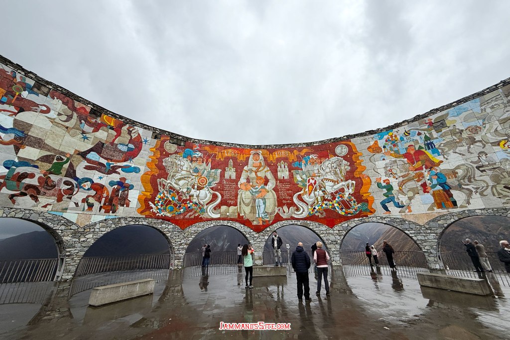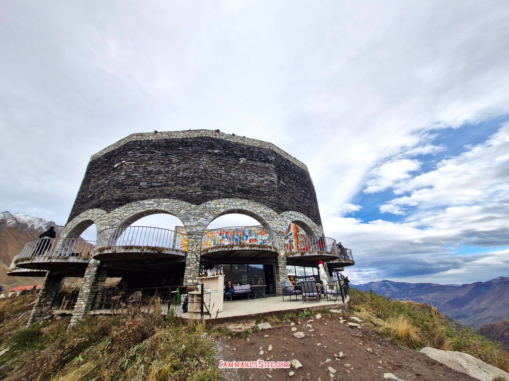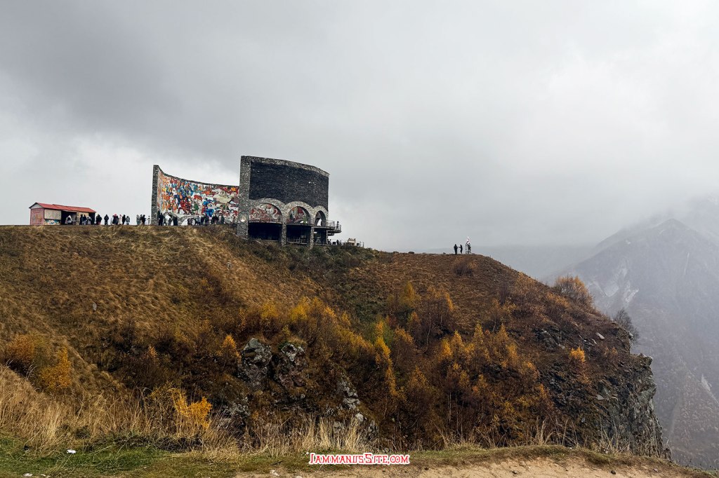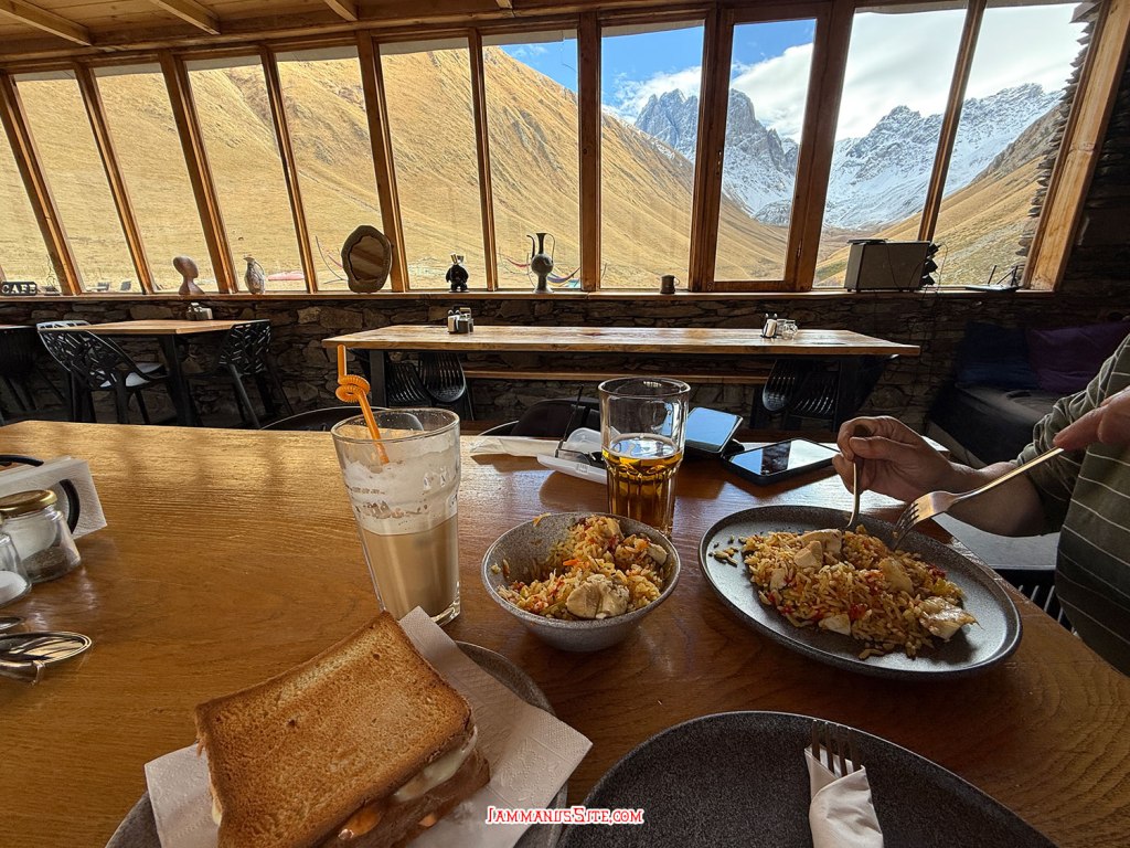 ในที่สุดก็มาถึง Russia-Georgia Friendship Monument ไม่ได้คิดจะแวะตอนนี้ กะจะแวะเที่ยวขากลับ แถมวันนี้อากาศไม่ดี มีฝนลงพรำๆด้วย แต่ว่าหิวข้าวมาก ก็เลยแวะเพราะเห็นมีร้านอาหาร จอดรถปุ๊บมีคนมาเก็บค่าจอดทันที 3GEL ติดกับ Monument มีร้านอาหารอินเดีย ก็เดินไปหาข้าวกิน แนะนำเลย… แนะนำว่า…ให้หนีไปไกลๆ คือราคาโหดมาก แพงที่สุดในทริปเลย สั่งอาหาร 2 อย่าง ไม่มีน้ำด้วยซ้ำ 95GEL! (คือเห็นราคาแล้วแหละแต่หิวจนไม่ไหวแล้ว) คือรสชาติก็ไม่ได้แย่ กินได้ แต่แพงเหลือเกิน มานึกทีหลังว่า ไหนๆก็แขวนท้องมาถึงนี่แล้วอีก 1/2 ชม.ก็ถึงตัวเมือง Kazbegi แล้ว น่าจะยอมทนหิวไปเลย