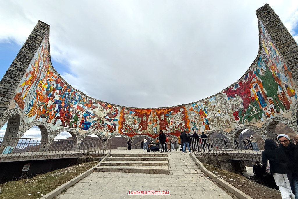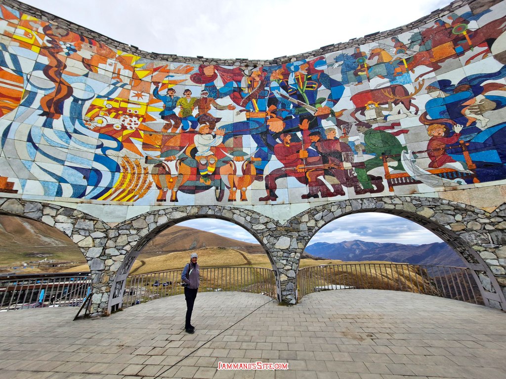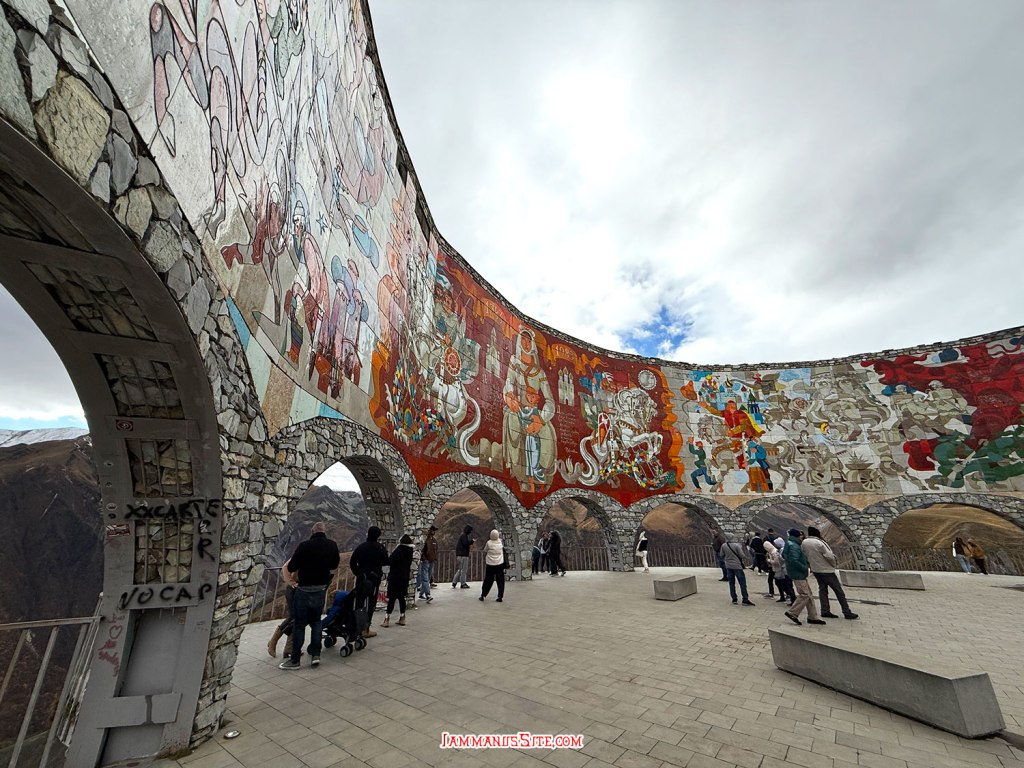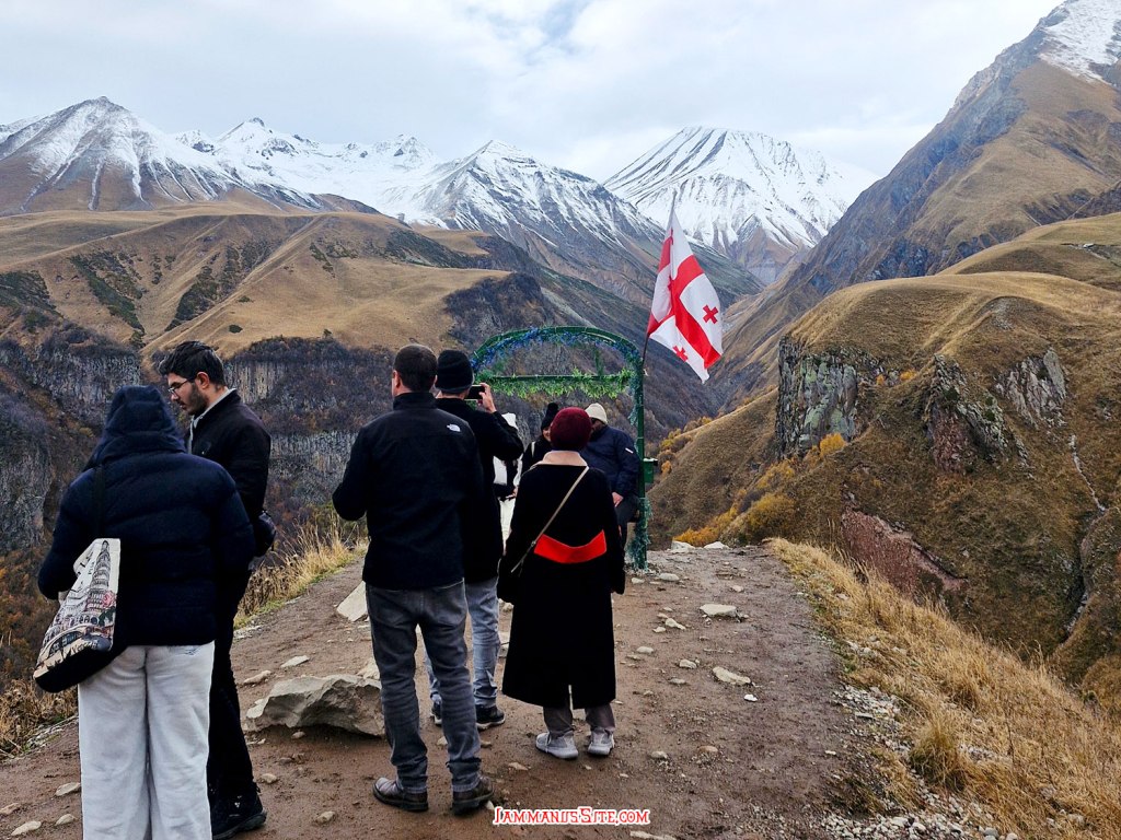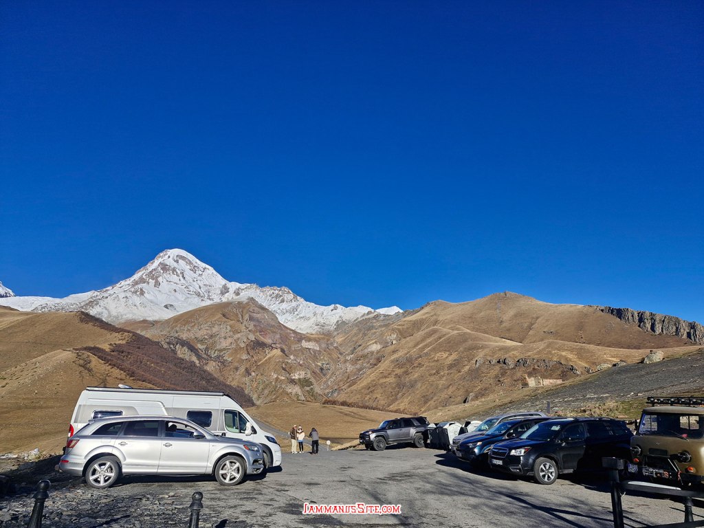 ในที่สุดก็มาถึง Russia-Georgia Friendship Monument ไม่ได้คิดจะแวะตอนนี้ กะจะแวะเที่ยวขากลับ แถมวันนี้อากาศไม่ดี มีฝนลงพรำๆด้วย แต่ว่าหิวข้าวมาก ก็เลยแวะเพราะเห็นมีร้านอาหาร จอดรถปุ๊บมีคนมาเก็บค่าจอดทันที 3GEL ติดกับ Monument มีร้านอาหารอินเดีย ก็เดินไปหาข้าวกิน แนะนำเลย… แนะนำว่า…ให้หนีไปไกลๆ คือราคาโหดมาก แพงที่สุดในทริปเลย สั่งอาหาร 2 อย่าง ไม่มีน้ำด้วยซ้ำ 95GEL! (คือเห็นราคาแล้วแหละแต่หิวจนไม่ไหวแล้ว) คือรสชาติก็ไม่ได้แย่ กินได้ แต่แพงเหลือเกิน มานึกทีหลังว่า ไหนๆก็แขวนท้องมาถึงนี่แล้วอีก 1/2 ชม.ก็ถึงตัวเมือง Kazbegi แล้ว น่าจะยอมทนหิวไปเลย