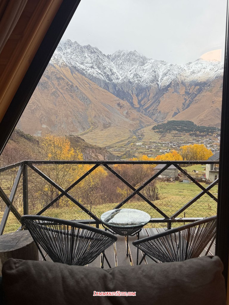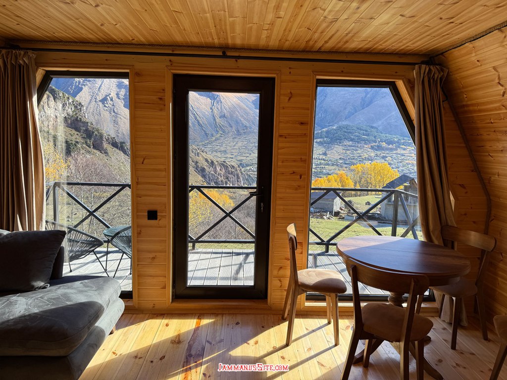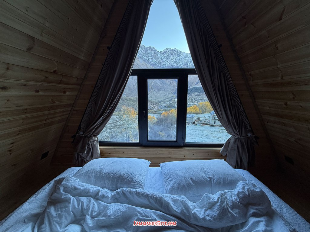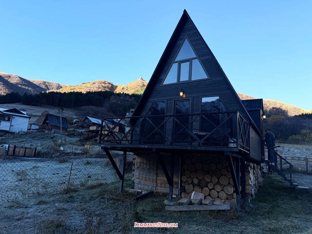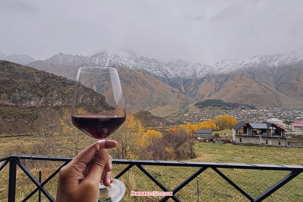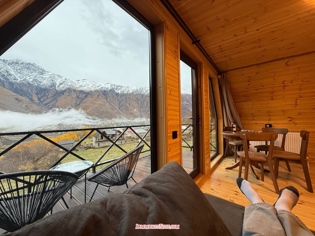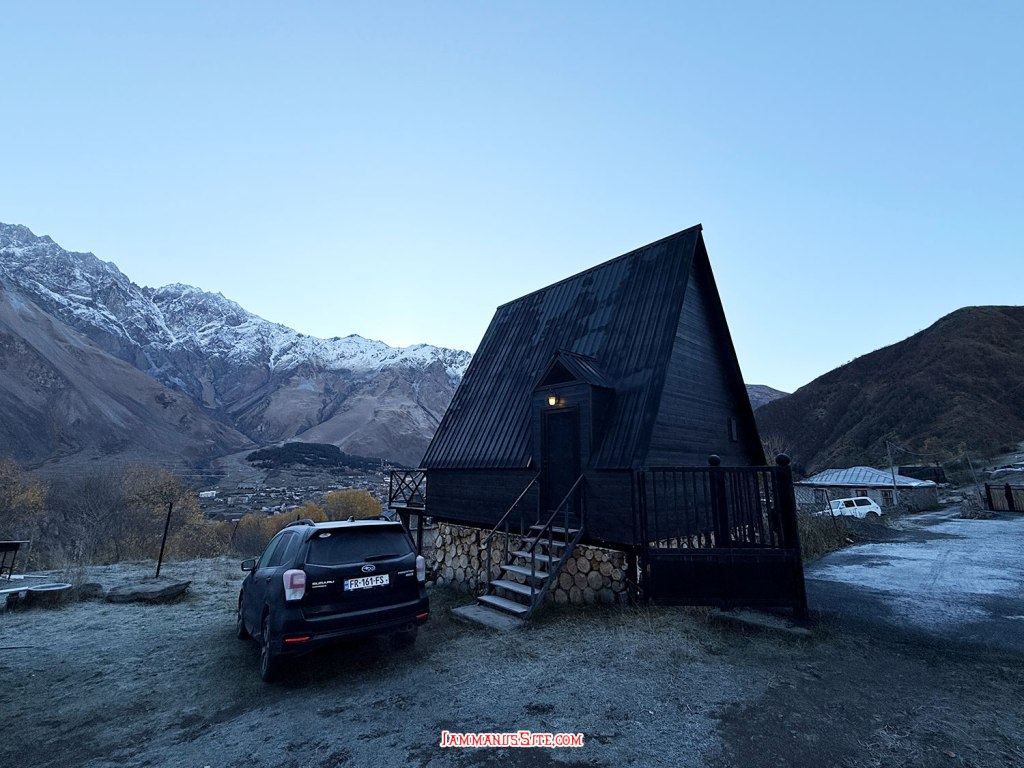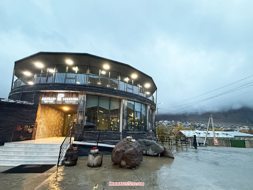 ที่พักของเราเป็น Cottage บ้านดี บรรยากาศเยี่ยม ให้ 10/10 เป็นที่พักประทับใจสุดในทริปเลย รีวิวด้านล่างนะ อย่างที่เล่าข้างบนว่ามาถึงตัวเมืองฝนลงปรอยๆ ออกไปมองหา Gergeti Trinity Church บนยอดเขา มองเห็นได้แต่ฟ้าไม่สวย ก็เลยชงกาแฟจิบให้ร่างกายอุ่นๆ นั่งพักหลังการขับรถมายาวๆ 150 กม. ตกเย็นๆก็เปิดไวน์นั่งจิบชมเทือกเขาคาซเบกไปจนมืด ที่พักมีครัวแต่มื้อนี้เรายังขี้เกียจทำอาหาร เลยขับรถออกไปหาร้านกินในเมือง
