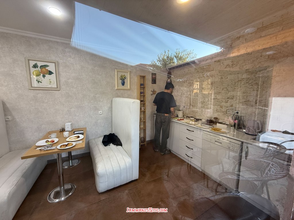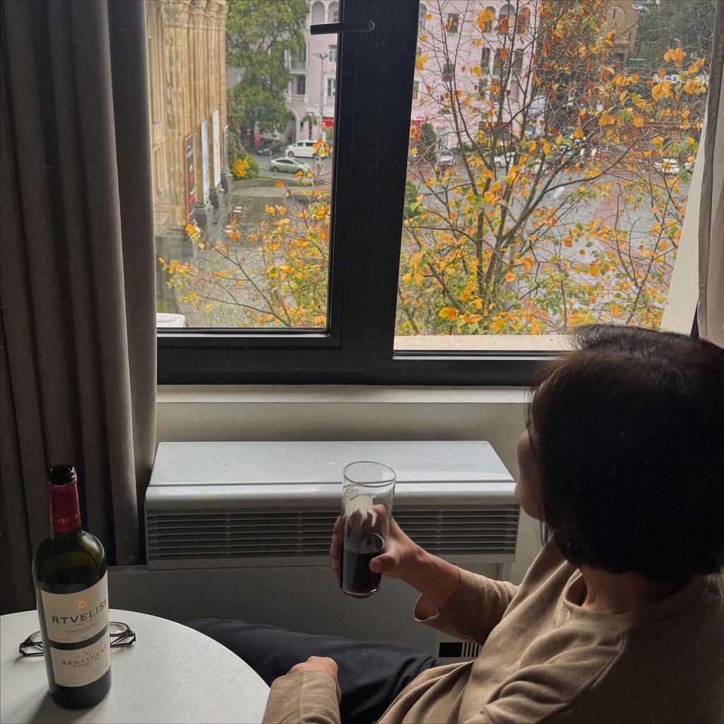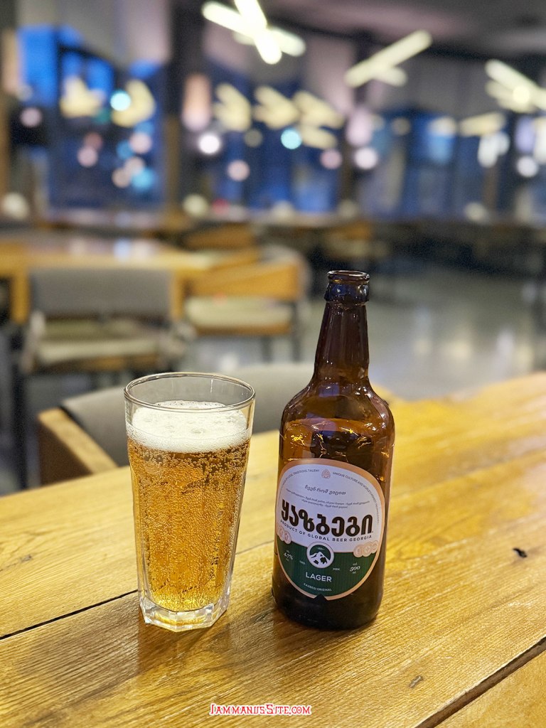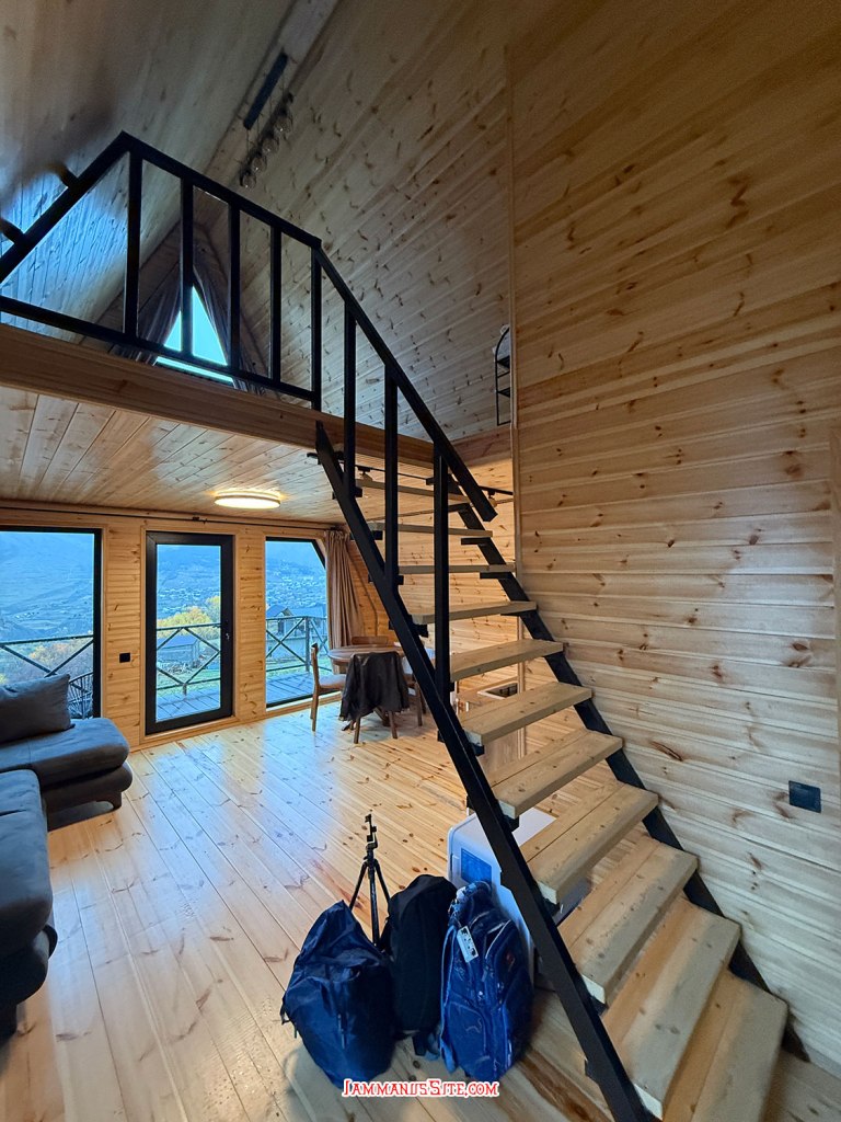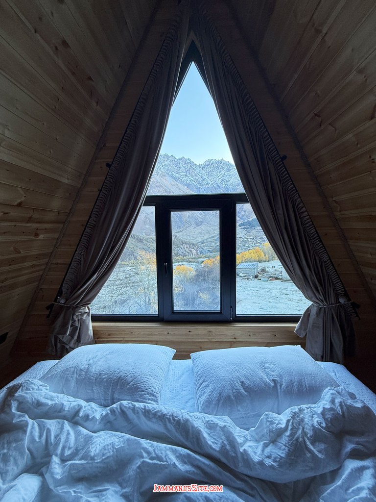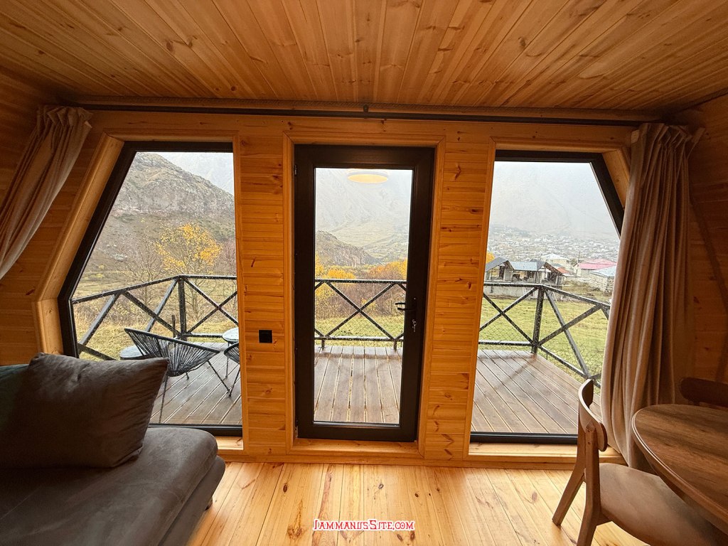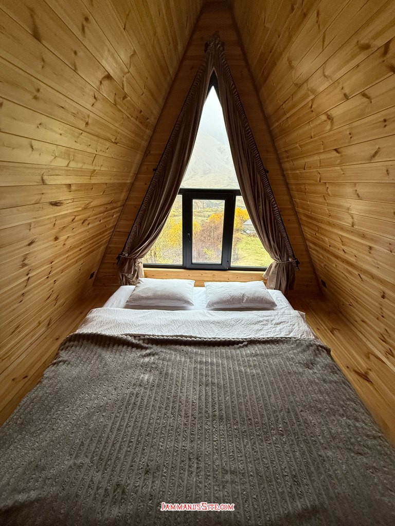 ที่พักของเราเป็น Cottage บ้านดี บรรยากาศเยี่ยม ให้ 10/10 เป็นที่พักประทับใจสุดในทริปเลย รีวิวด้านล่างนะ อย่างที่เล่าข้างบนว่ามาถึงตัวเมืองฝนลงปรอยๆ ออกไปมองหา Gergeti Trinity Church บนยอดเขา มองเห็นได้แต่ฟ้าไม่สวย ก็เลยชงกาแฟจิบให้ร่างกายอุ่นๆ นั่งพักหลังการขับรถมายาวๆ 150 กม. ตกเย็นๆก็เปิดไวน์นั่งจิบชมเทือกเขาคาซเบกไปจนมืด ที่พักมีครัวแต่มื้อนี้เรายังขี้เกียจทำอาหาร เลยขับรถออกไปหาร้านกินในเมือง