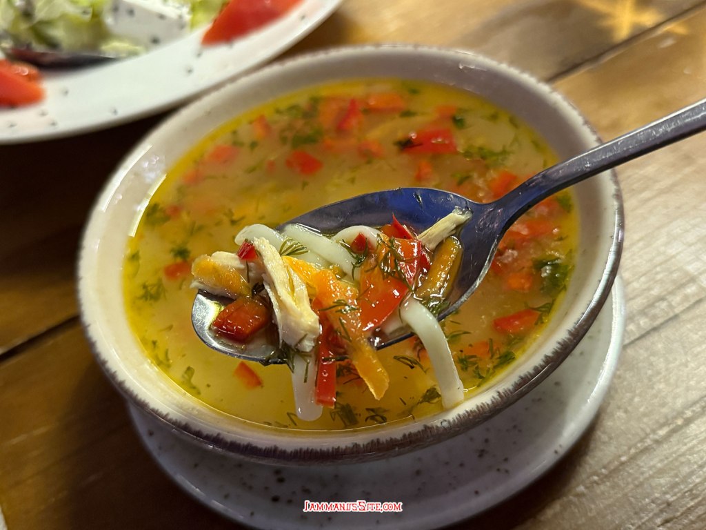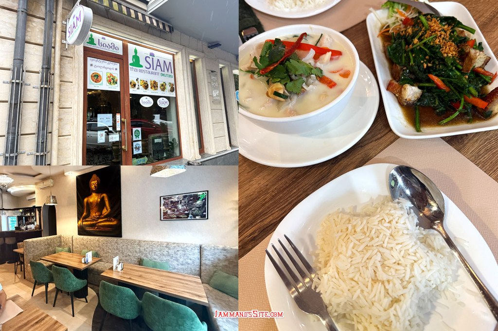 ร้านอาหารไทยที่อ่านรีวิวมา ก็เลยมาอย่างตั้งใจ ร้านอาหารไทยแต่เข้าไปเจอพนักงานเป็นคนจอร์เจีย ไม่เจอคนไทยเลย อุตส่าห์สั่งเป็นภาษาอังกฤษ ฝรั่งบอก อ่อ….โต้มข่าก่าย แบบสำเนียงคาราโอเกะ มื้อนี้สั่งต้มข่าไก่ กับป๋วยเล้งผัดหมูกรอบ อร่อยทั้ง 2 อย่าง สงสัยแม่ครัวคนไทย แต่ให้ฝรั่งอยู่หน้าร้าน กับข้าว 2 อย่าง ข้าว 2 จาน น้ำ 2 ขวด รวม 66GEL